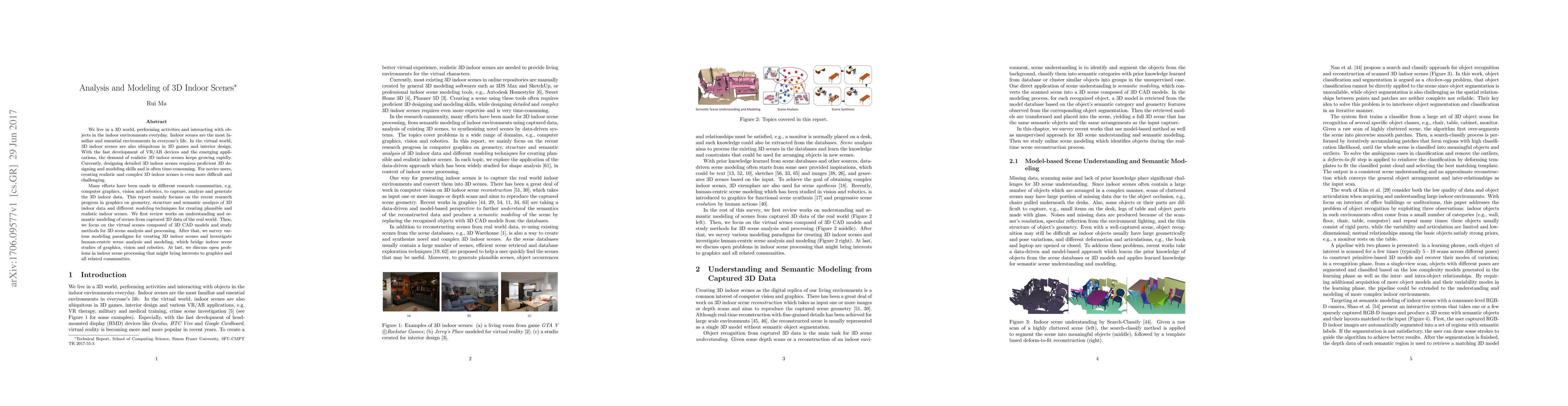 This paper reviews recent advancements in the analysis and modeling of 3D indoor scenes, focusing on geometry, structure, and semantic modeling. It surveys techniques for generating realistic indoor scenes, bridging insights from computer graphics, vision, and robotics, and highlights open challenges in the field.