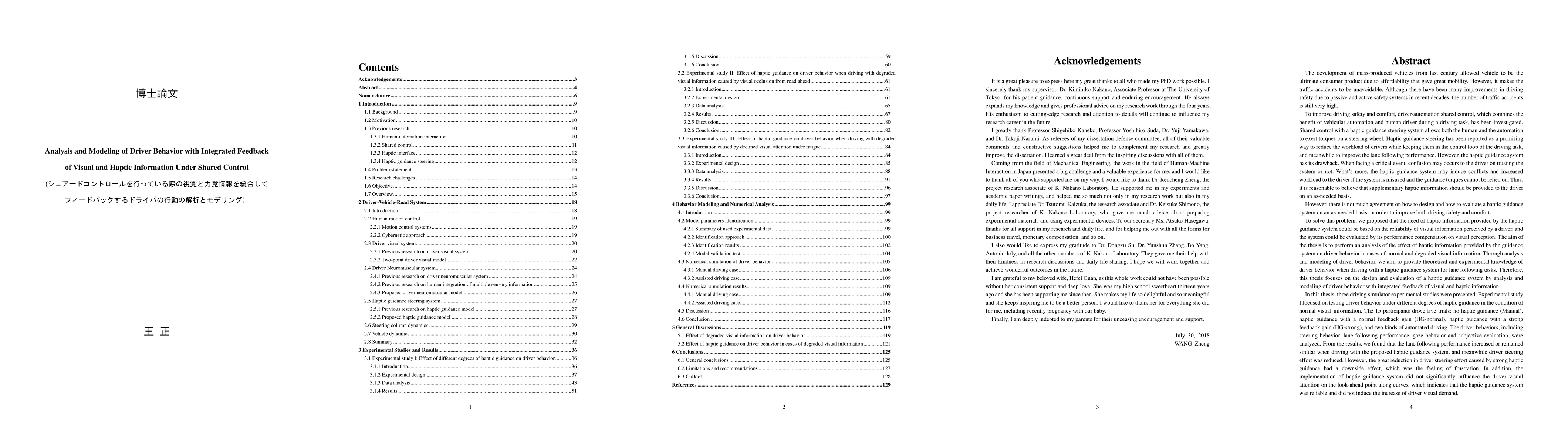 The thesis presents contributions made to the evaluation and design of a haptic guidance system on improving driving performance in cases of normal and degraded visual information, which are based on behavior experiments, modeling and numerical simulations. The effect of shared control on driver behavior in cases of normal and degraded visual information has been successfully evaluated experimentally and numerically. The evaluation results indicate that the proposed haptic guidance system is capable of providing reliable haptic information, and is effective on improving lane following performance in the conditions of visual occlusion from road ahead and declined visual attention under fatigue driving. Moreover, the appropriate degree of haptic guidance is highly related to the reliability of visual information perceived by the driver, which suggests that designing the haptic guidance system based on the reliability of visual information would allow for greater driver acceptance. Furthermore, the parameterized driver model, which considers the integrated feedback of visual and haptic information, is capable of predicting driver behavior under shared control, and has the potential of being used for designing and evaluating the haptic guidance system.