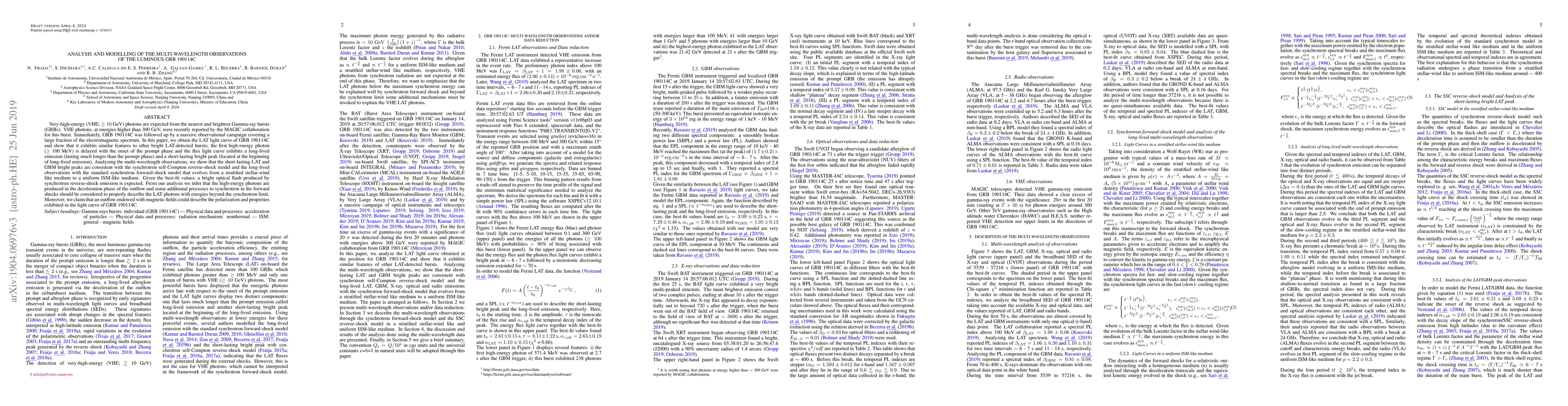 Very-high-energy (VHE; $\geq 10$ GeV) photons are expected from the nearest and brightest Gamma-ray bursts (GRBs). VHE photons, at energies higher than 300 GeV, were recently reported by the MAGIC collaboration for this burst. Immediately, GRB 190114C was followed up by a massive observational campaign covering a large fraction of the electromagnetic spectrum. In this paper, we obtain the LAT light curve of GRB 190114C and show that it exhibits similar features to other bright LAT-detected bursts; the first high-energy photon ($\geq$ 100 MeV) is delayed with the onset of the prompt phase and the flux light curve exhibits a long-lived emission (lasting much longer than the prompt phase) and a short-lasting bright peak (located at the beginning of long-lived emission). Analyzing the multi-wavelength observations, we show that the short-lasting LAT and GBM bright peaks are consistent with the synchrotron self-Compton reverse-shock model and the long-lived observations with the standard synchrotron forward-shock model that evolves from a stratified stellar-wind like medium to a uniform ISM-like medium. Given the best-fit values, a bright optical flash produced by synchrotron reverse-shock emission is expected. From our analysis we infer that the high-energy photons are produced in the deceleration phase of the outflow and some additional processes to synchrotron in the forward shocks should be considered to properly describe the LAT photons with energies beyond the synchrotron limit. Moreover, we claim that an outflow endowed with magnetic fields could describe the polarization and properties exhibited in the light curve of GRB 190114C.