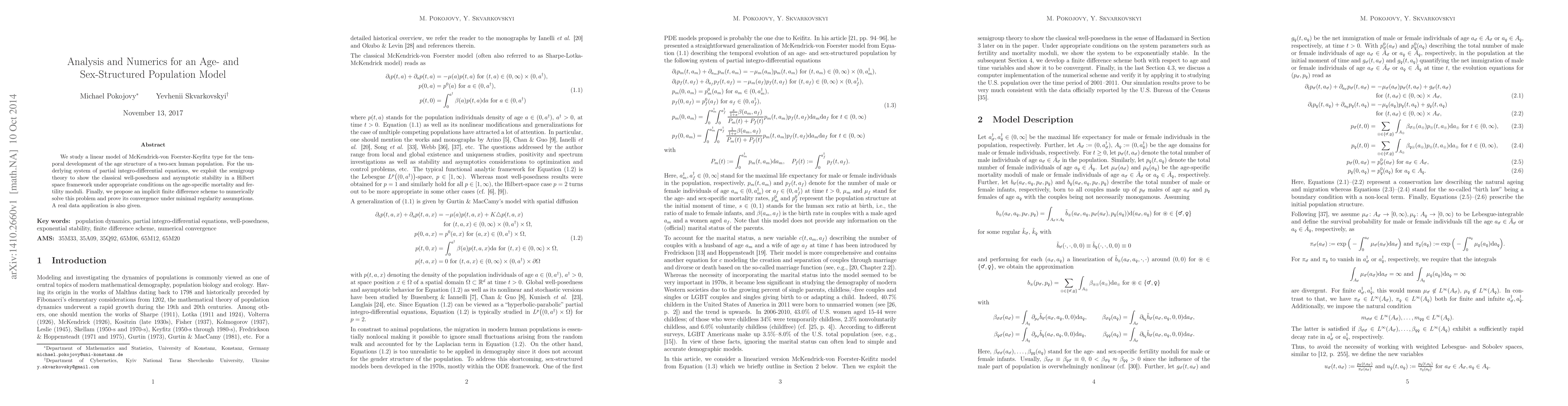 This paper analyzes a linear age- and sex-structured population model using semigroup theory to demonstrate well-posedness and stability. It proposes an implicit finite difference scheme for numerical solutions, proving its convergence, and applies the method to real data.