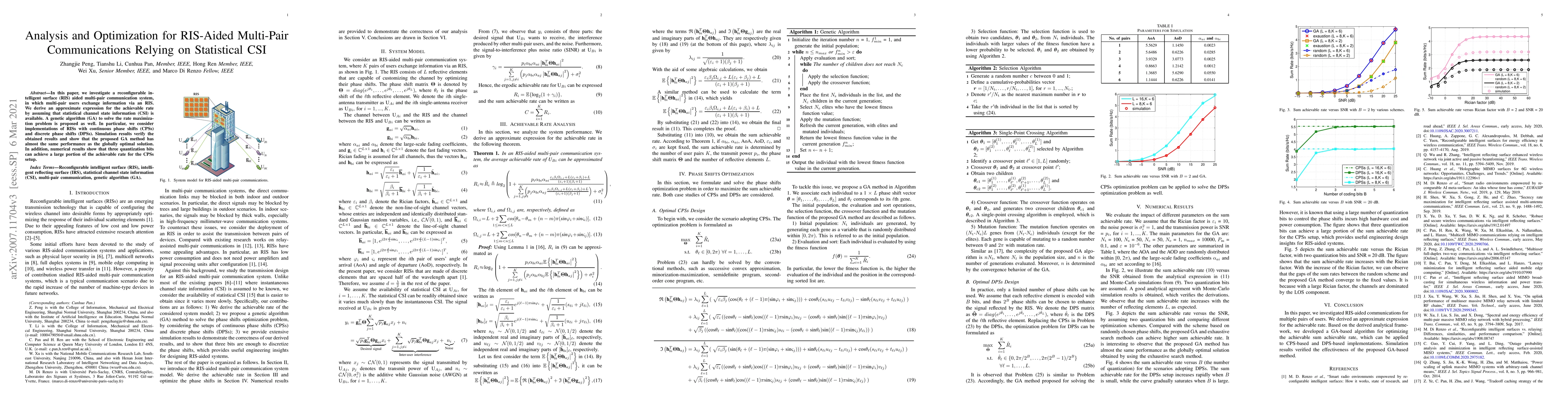 In this paper, we investigate a reconfigurable intelligent surface (RIS) aided multi-pair communication system, in which multi-pair users exchange information via an RIS. We derive an approximate expression of the achievable rate by assuming that statistical channel state information (CSI) is available. A genetic algorithm (GA) to solve the rate maximization problem is proposed as well. In particular, we consider implementations of RISs with continuous phase shifts (CPSs) and discrete phase shifts (DPSs). Simulation results verify the correctness of the obtained results and show that the proposed GA method has almost the same performance as the globally optimal solution. In addition, numerical results show that three quantization bits can achieve a large portion of the sum achievable rate for the CPSs setup.