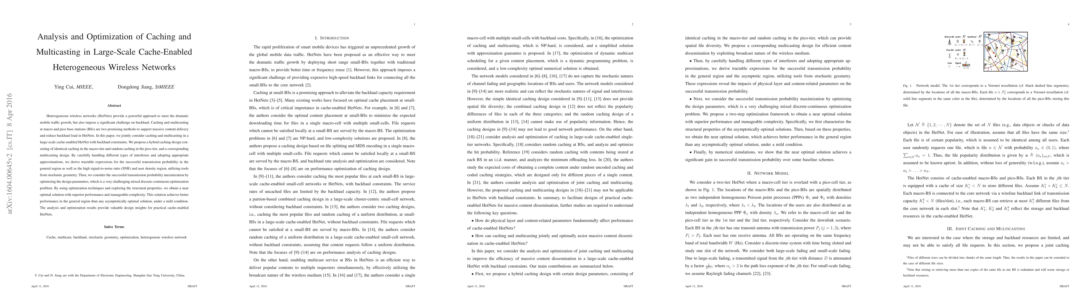 This paper analyzes and optimizes caching and multicasting strategies in large-scale cache-enabled heterogeneous wireless networks to reduce backhaul load. It proposes a hybrid caching design and derives expressions for successful transmission probability, optimizing these parameters to achieve a near-optimal solution with superior performance and manageable complexity.
