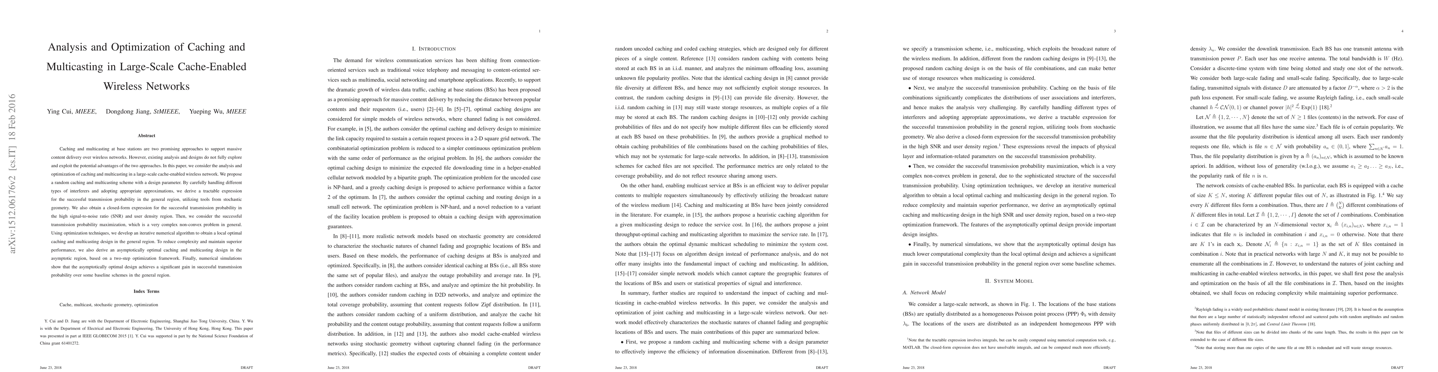 This paper analyzes and optimizes caching and multicasting in large-scale wireless networks to enhance content delivery. It proposes a random caching and multicasting scheme, deriving tractable expressions for successful transmission probability and developing an iterative algorithm for optimization, achieving significant gains over baseline schemes.