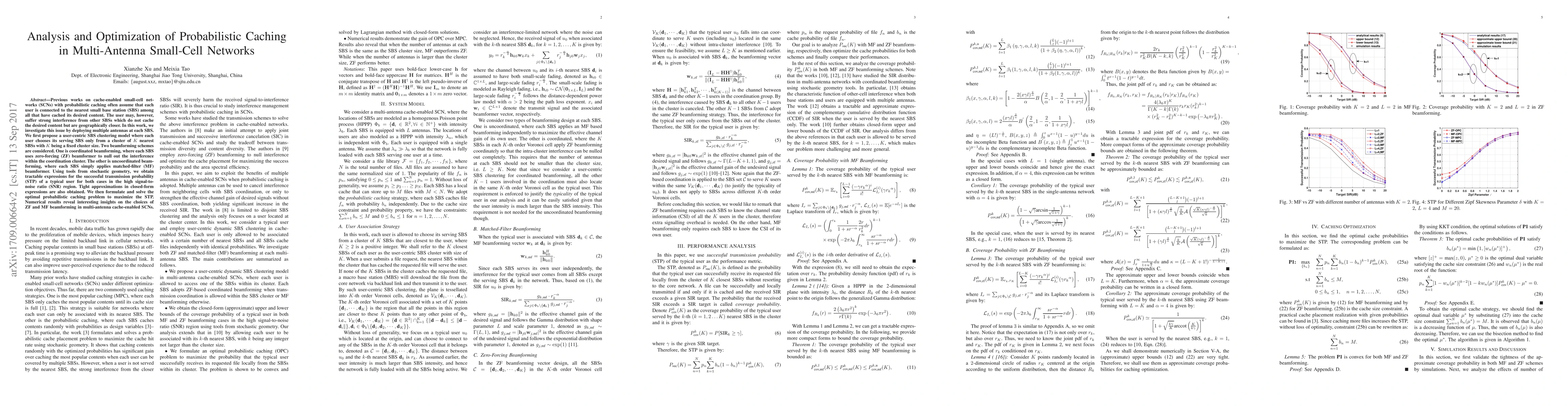 This paper analyzes and optimizes probabilistic caching in multi-antenna small-cell networks, proposing a user-centric SBS clustering model with coordinated and uncoordinated beamforming. It derives expressions for successful transmission probability and solves the optimal caching problem to maximize it, providing insights into beamforming choices.