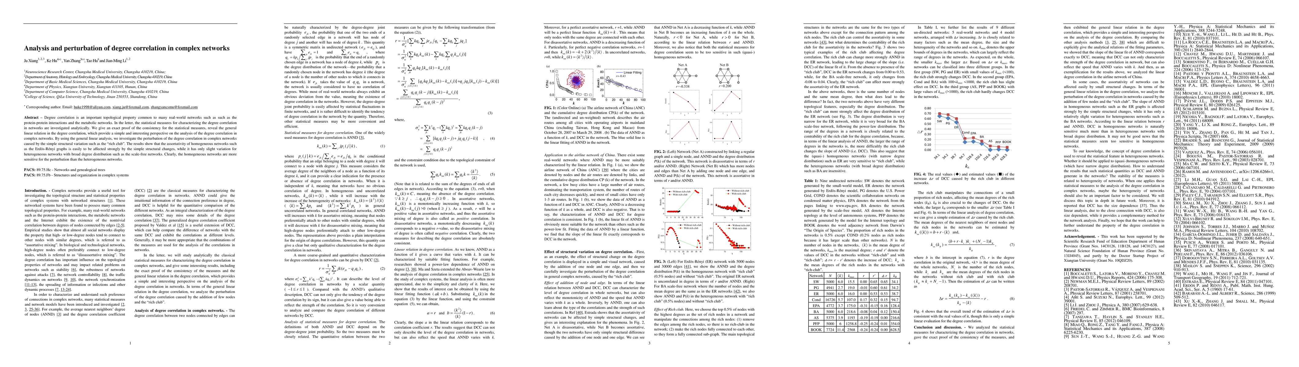 This paper investigates statistical measures for degree correlation in complex networks, proving their consistency and revealing a general linear relation. It also examines how structural changes, like adding nodes or forming rich clubs, affect degree correlation, finding that homogeneous networks like ER graphs are more sensitive to perturbations than heterogeneous networks like scale-free networks.