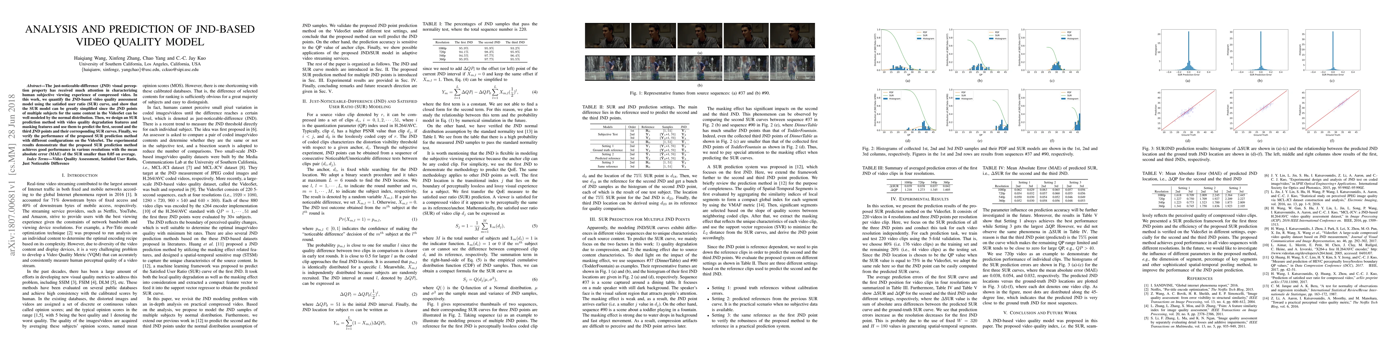 This paper develops a JND-based video quality assessment model using the satisfied user ratio (SUR) curve, demonstrating that JND points follow a normal distribution. It proposes an SUR prediction method incorporating video quality and masking features to predict JND points and corresponding SUR curves, achieving a mean absolute error of less than 0.05 across various resolutions.