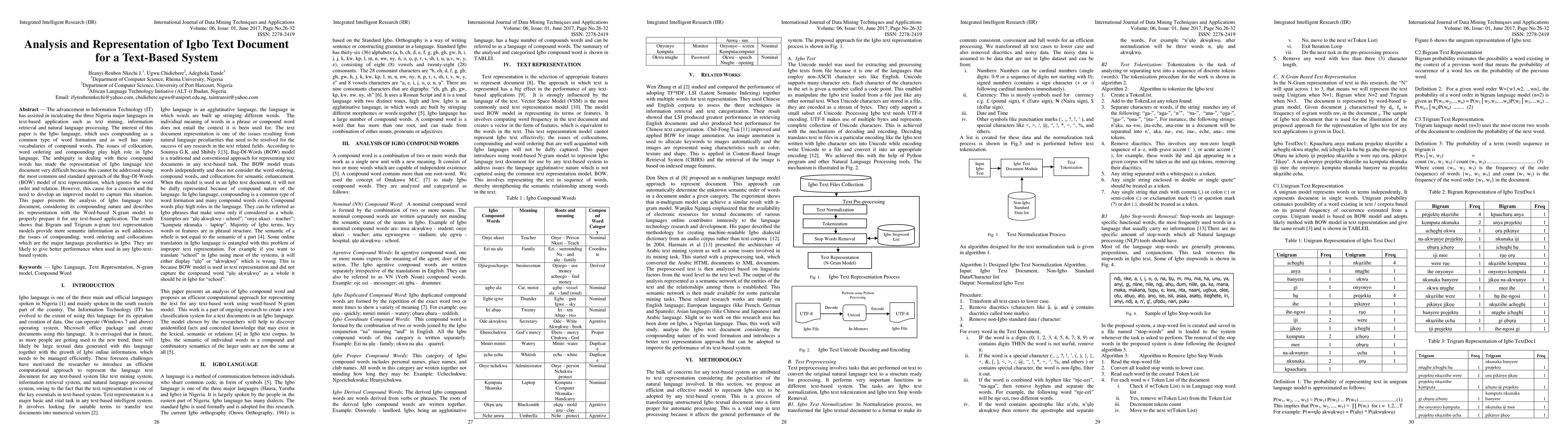 This paper analyzes the Igbo language text document, focusing on its unique compounding nature and complex word order. It proposes the Word-based N-gram model for better representation, showing that Bigram and Trigram models effectively address compounding and collocation issues, thus improving performance in Igbo text-based applications.