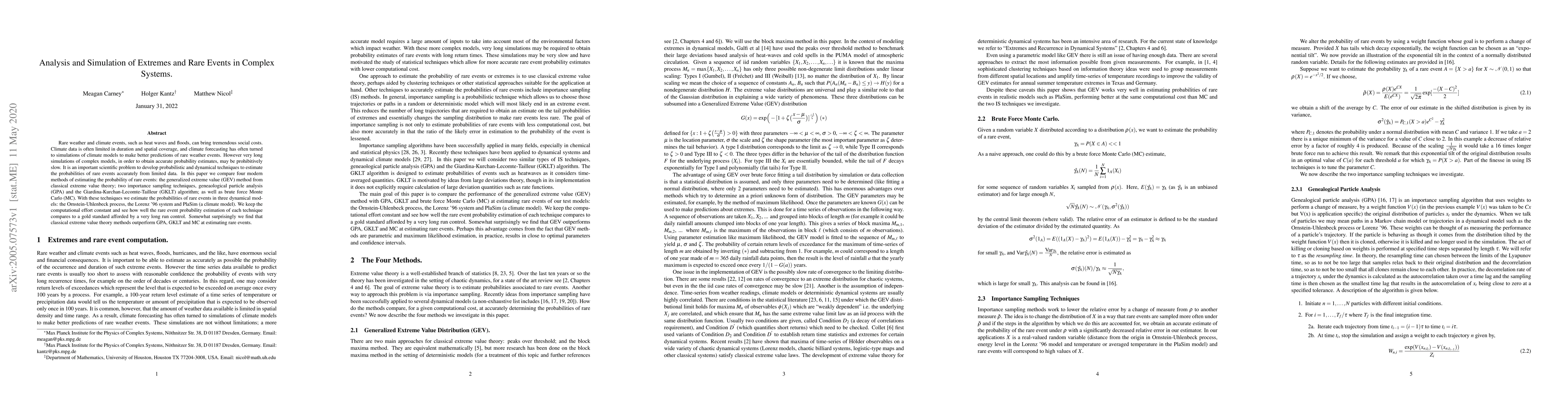 This paper compares four methods for estimating the probabilities of rare weather events: the GEV method, GPA, GKLT algorithm, and brute force Monte Carlo. Despite computational constraints, classical extreme value theory methods outperform the other techniques in estimating rare events in three dynamical models.