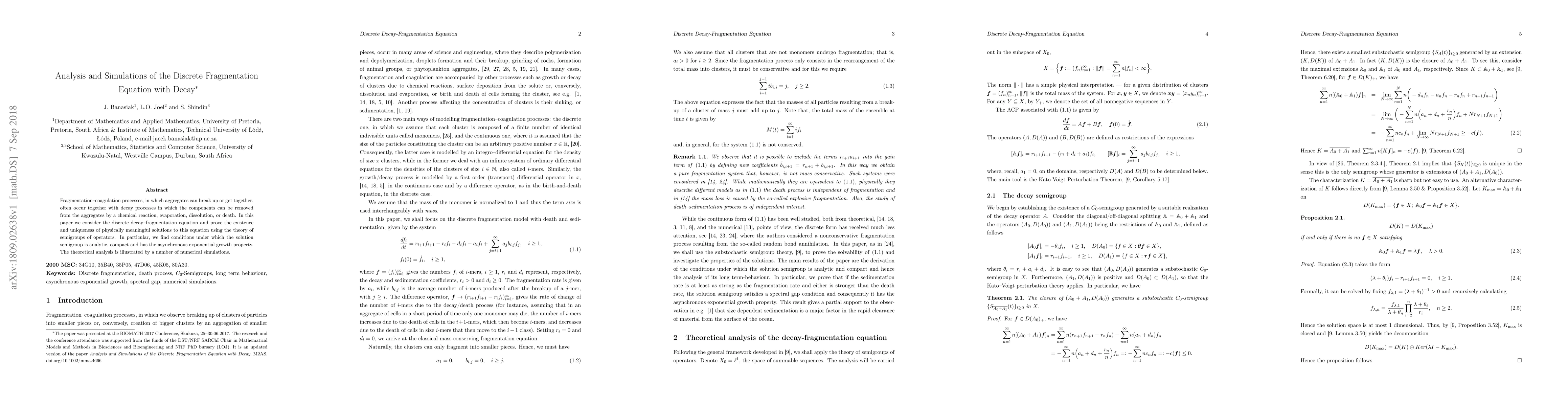 This paper analyzes the discrete decay-fragmentation equation, proving the existence and uniqueness of solutions using semigroup theory. It identifies conditions for the solution semigroup to be analytic, compact, and exhibit asynchronous exponential growth, supported by numerical simulations.