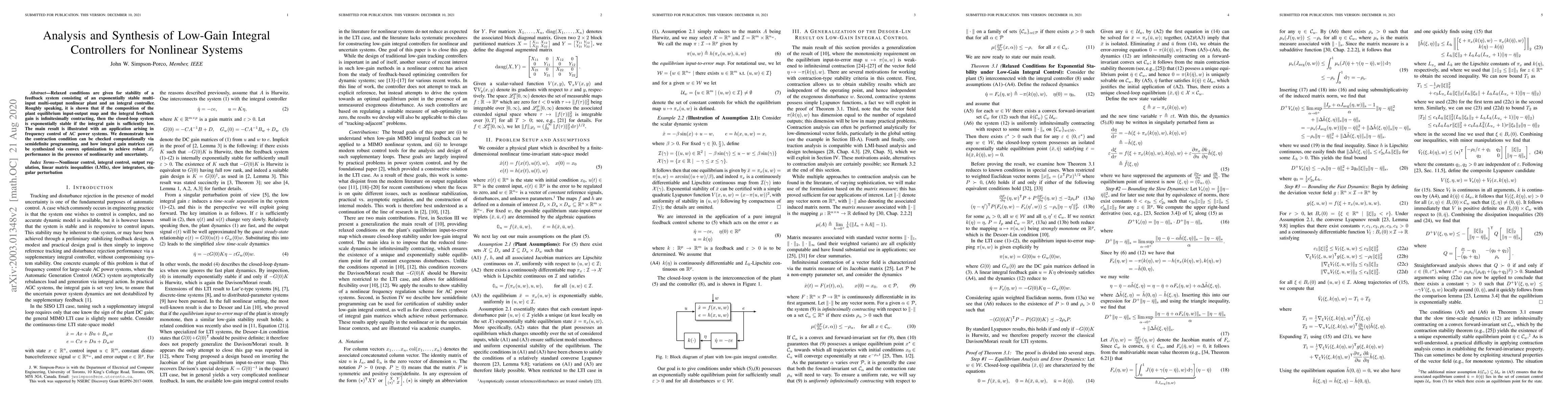 This paper presents relaxed stability conditions for feedback systems combining exponentially stable nonlinear plants with low-gain integral controllers, ensuring exponential stability under certain contraction conditions. It applies these results to AC power system frequency control, demonstrating computational feasibility via semidefinite programming and convex optimization for integral gain synthesis.