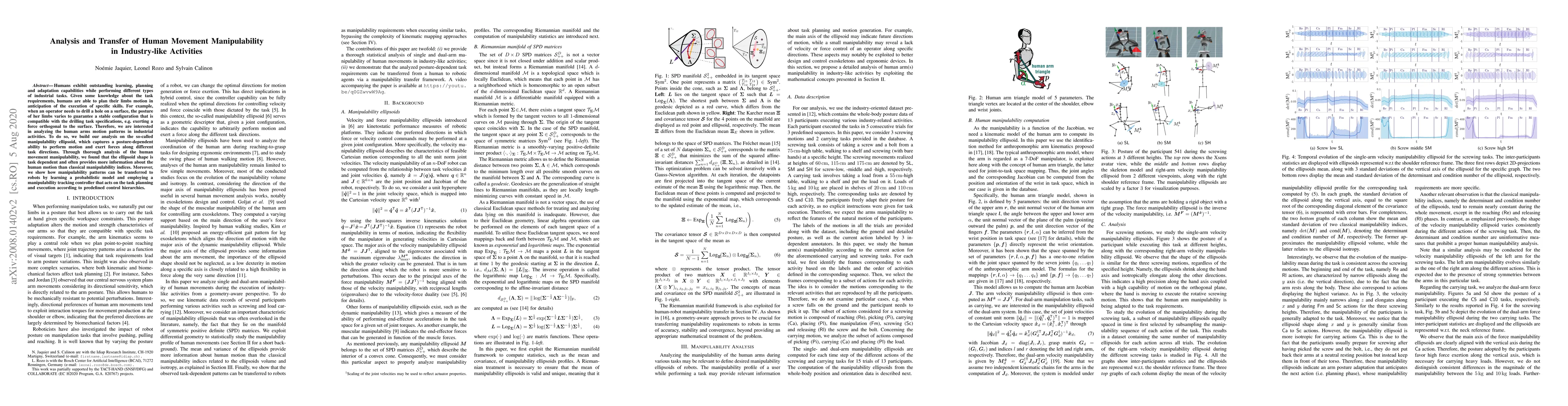 Humans exhibit outstanding learning, planning and adaptation capabilities while performing different types of industrial tasks. Given some knowledge about the task requirements, humans are able to plan their limbs motion in anticipation of the execution of specific skills. For example, when an operator needs to drill a hole on a surface, the posture of her limbs varies to guarantee a stable configuration that is compatible with the drilling task specifications, e.g. exerting a force orthogonal to the surface. Therefore, we are interested in analyzing the human arms motion patterns in industrial activities. To do so, we build our analysis on the so-called manipulability ellipsoid, which captures a posture-dependent ability to perform motion and exert forces along different task directions. Through thorough analysis of the human movement manipulability, we found that the ellipsoid shape is task dependent and often provides more information about the human motion than classical manipulability indices. Moreover, we show how manipulability patterns can be transferred to robots by learning a probabilistic model and employing a manipulability tracking controller that acts on the task planning and execution according to predefined control hierarchies.