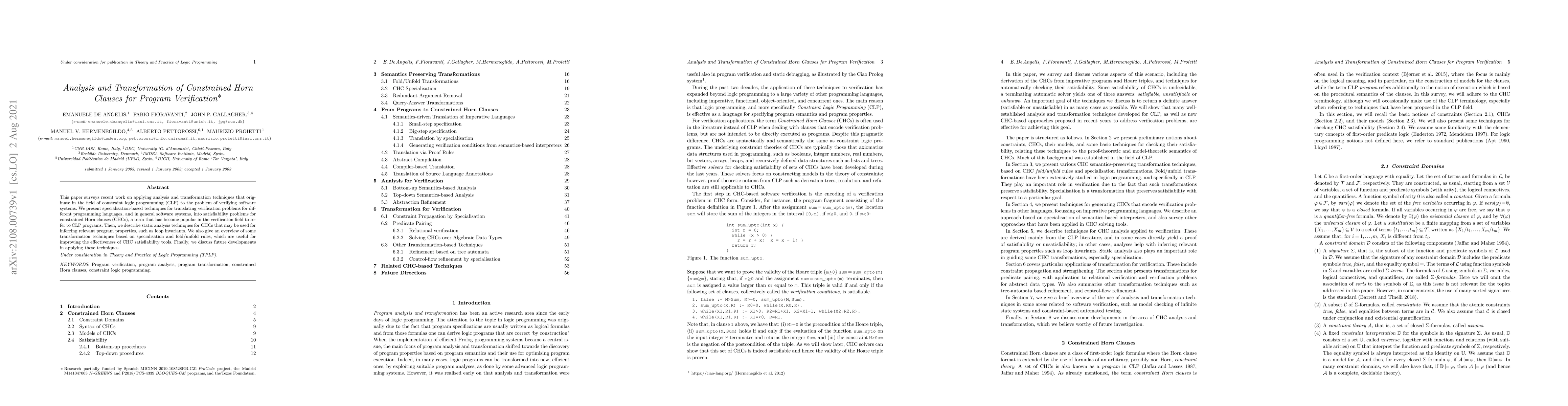 This paper reviews techniques from constraint logic programming applied to software verification, focusing on translating verification problems into constrained Horn clauses (CHCs) and presenting static analysis methods for inferring program properties. It also discusses transformation techniques to enhance CHC satisfiability tools and outlines future research directions.