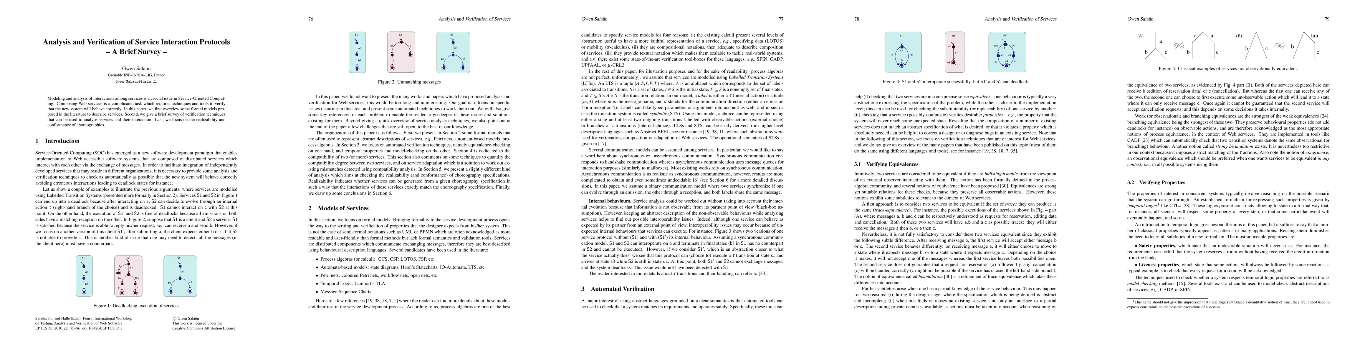 Modeling and analysis of interactions among services is a crucial issue in Service-Oriented Computing. Composing Web services is a complicated task which requires techniques and tools to verify that the new system will behave correctly. In this paper, we first overview some formal models proposed in the literature to describe services. Second, we give a brief survey of verification techniques that can be used to analyse services and their interaction. Last, we focus on the realizability and conformance of choreographies.