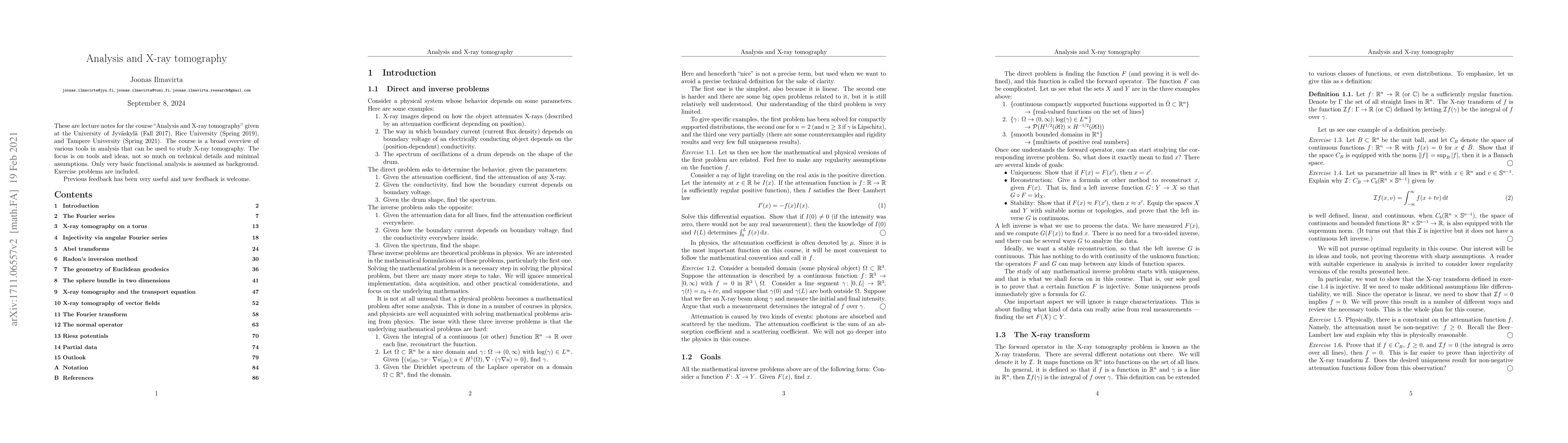 This course provides an overview of analytical tools applied to X-ray tomography, emphasizing conceptual understanding and broad ideas rather than technical details, with minimal prerequisites of basic functional analysis. Exercises are included to reinforce learning.