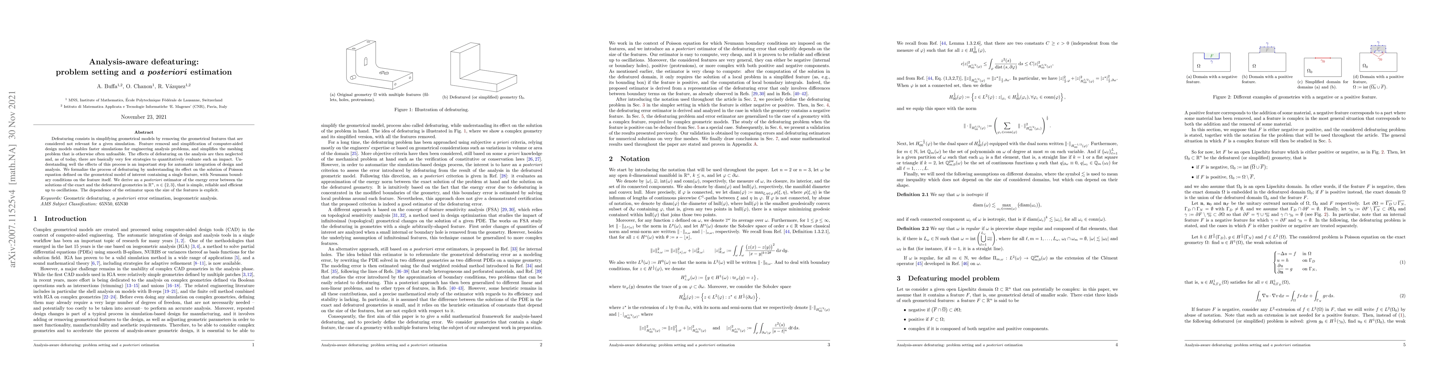 Defeaturing consists in simplifying geometrical models by removing the geometrical features that are considered not relevant for a given simulation. Feature removal and simplification of computer-aided design models enables faster simulations for engineering analysis problems, and simplifies the meshing problem that is otherwise often unfeasible. The effects of defeaturing on the analysis are then neglected and, as of today, there are basically very few strategies to quantitatively evaluate such an impact. Understanding well the effects of this process is an important step for automatic integration of design and analysis. We formalize the process of defeaturing by understanding its effect on the solution of Poisson equation defined on the geometrical model of interest containing a single feature, with Neumann boundary conditions on the feature itself. We derive an a posteriori estimator of the energy error between the solutions of the exact and the defeatured geometries in $\mathbb{R}^n$, $n\in\{2,3\}$, that is simple, reliable and efficient up to oscillations. The dependence of the estimator upon the size of the features is explicit.