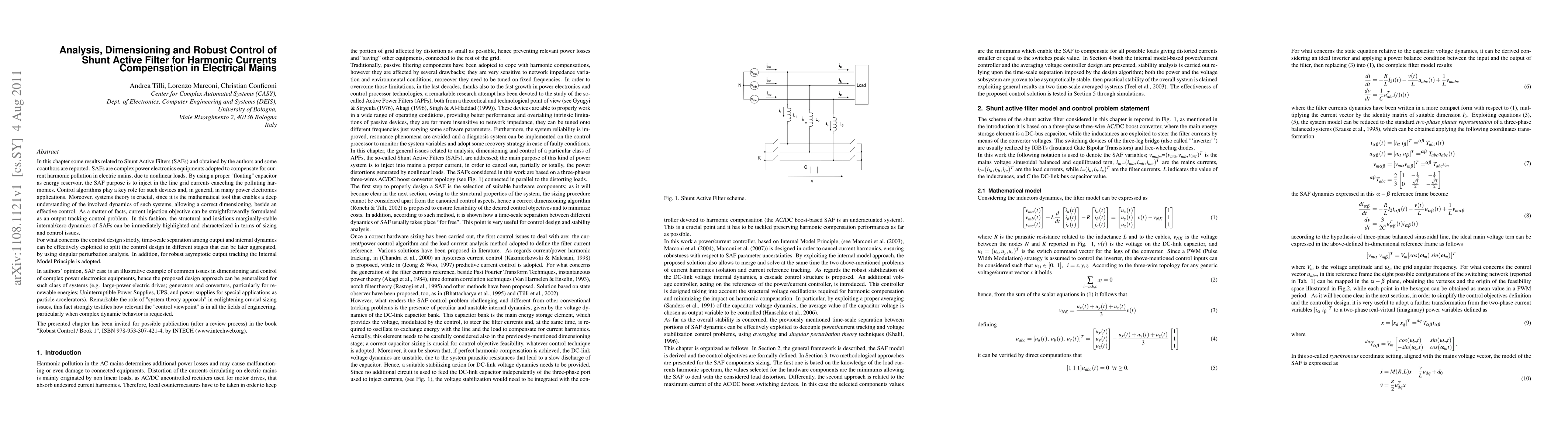 In this chapter some results related to Shunt Active Filters (SAFs) and obtained by the authors and some coauthors are reported. SAFs are complex power electronics equipments adopted to compensate for cur-rent harmonic pollution in electric mains, due to nonlinear loads. By using a proper "floating" capacitor as energy reservoir, the SAF purpose is to inject in the line grid currents canceling the polluting har-monics. Control algorithms play a key role for such devices and, in general, in many power electronics applications. Moreover, systems theory is crucial, since it is the mathematical tool that enables a deep understanding of the involved dynamics of such systems, allowing a correct dimensioning, beside an effective control. As a matter of facts, current injection objective can be straightforwardly formulated as an output tracking control problem. In this fashion, the structural and insidious marginally-stable internal/zero dynamics of SAFs can be immediately highlighted and characterized in terms of sizing and control issues. For what concerns the control design strictly, time-scale separation among output and internal dynamics can be effectively exploited to split the control design in different stages that can be later aggregated, by using singular perturbation analysis. In addition, for robust asymptotic output tracking the Internal Model Principle is adopted.