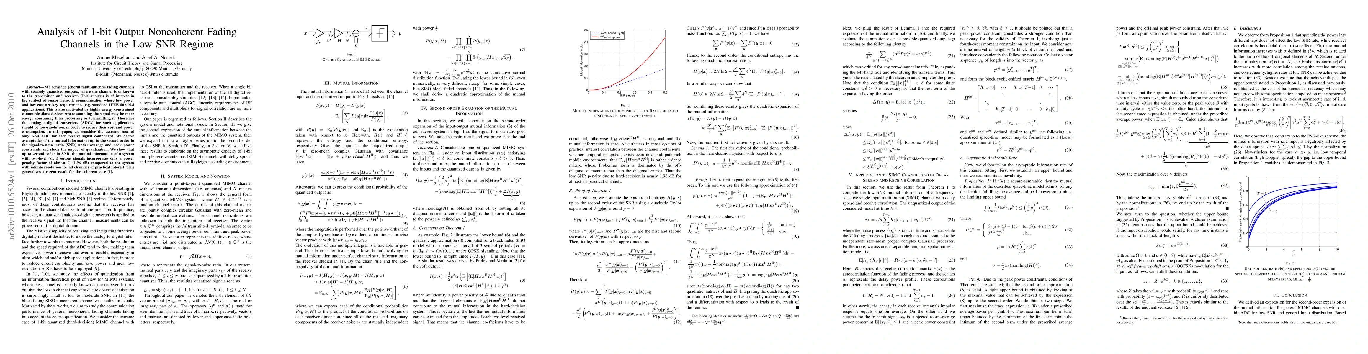 We consider general multi-antenna fading channels with coarsely quantized outputs, where the channel is unknown to the transmitter and receiver. This analysis is of interest in the context of sensor network communication where low power and low cost are key requirements (e.g. standard IEEE 802.15.4 applications). This is also motivated by highly energy constrained communications devices where sampling the signal may be more energy consuming than processing or transmitting it. Therefore the analog-to-digital converters (ADCs) for such applications should be low-resolution, in order to reduce their cost and power consumption. In this paper, we consider the extreme case of only 1-bit ADC for each receive signal component. We derive asymptotics of the mutual information up to the second order in the signal-to-noise ratio (SNR) under average and peak power constraints and study the impact of quantization. We show that up to second order in SNR, the mutual information of a system with two-level (sign) output signals incorporates only a power penalty factor of almost 1.96 dB compared to the system with infinite resolution for all channels of practical interest. This generalizes a recent result for the coherent case.