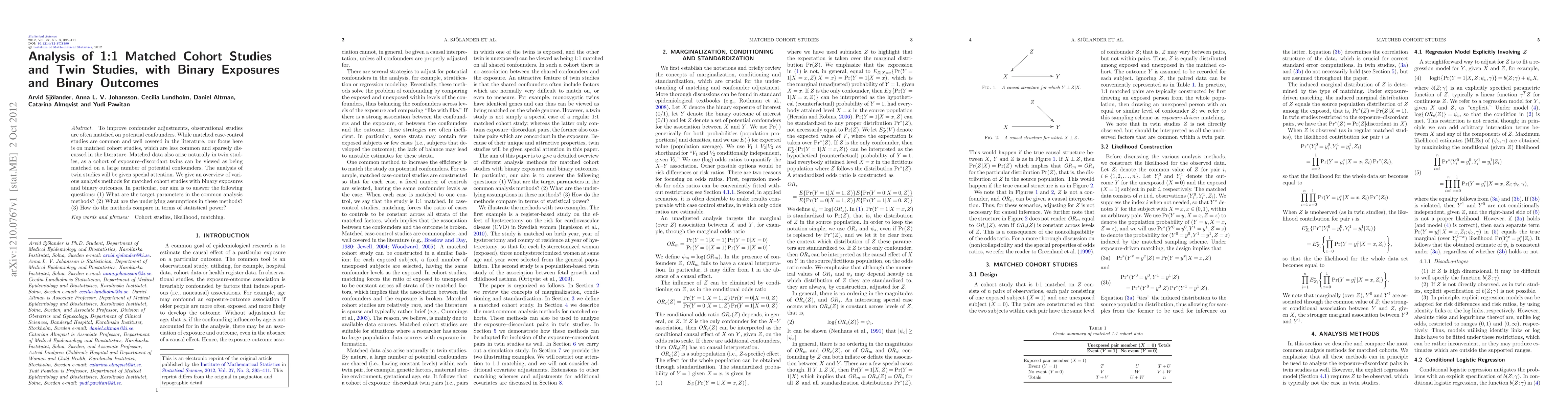 This paper provides an overview of analysis methods for matched cohort studies and twin studies with binary exposures and outcomes, focusing on confounder adjustments. It examines the target parameters, underlying assumptions, and statistical power of various methods used in these analyses.