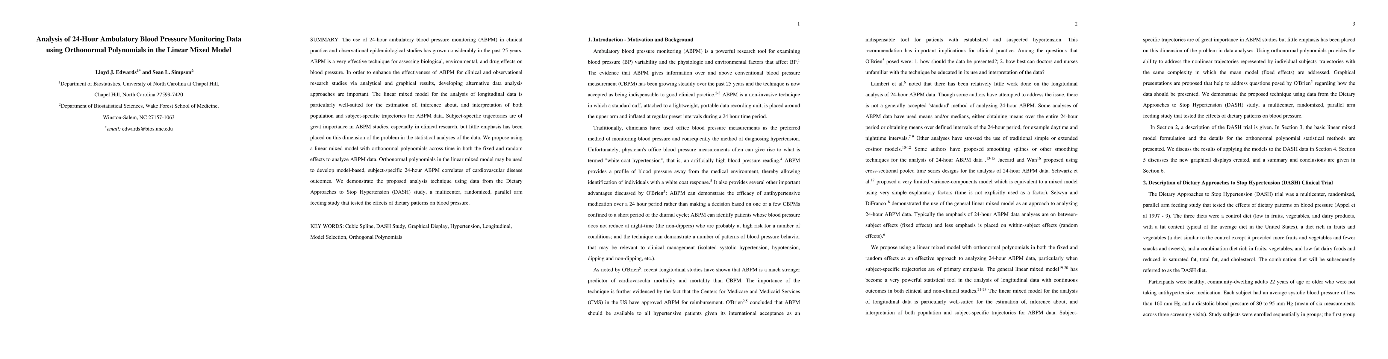 The use of 24-hour ambulatory blood pressure monitoring (ABPM) in clinical practice and observational epidemiological studies has grown considerably in the past 25 years. ABPM is a very effective technique for assessing biological, environmental, and drug effects on blood pressure. In order to enhance the effectiveness of ABPM for clinical and observational research studies via analytical and graphical results, developing alternative data analysis approaches are important. The linear mixed model for the analysis of longitudinal data is particularly well-suited for the estimation of, inference about, and interpretation of both population and subject-specific trajectories for ABPM data. Subject-specific trajectories are of great importance in ABPM studies, especially in clinical research, but little emphasis has been placed on this dimension of the problem in the statistical analyses of the data. We propose using a linear mixed model with orthonormal polynomials across time in both the fixed and random effects to analyze ABPM data. Orthonormal polynomials in the linear mixed model may be used to develop model-based, subject-specific 24-hour ABPM correlates of cardiovascular disease outcomes. We demonstrate the proposed analysis technique using data from the Dietary Approaches to Stop Hypertension (DASH) study, a multicenter, randomized, parallel arm feeding study that tested the effects of dietary patterns on blood pressure.