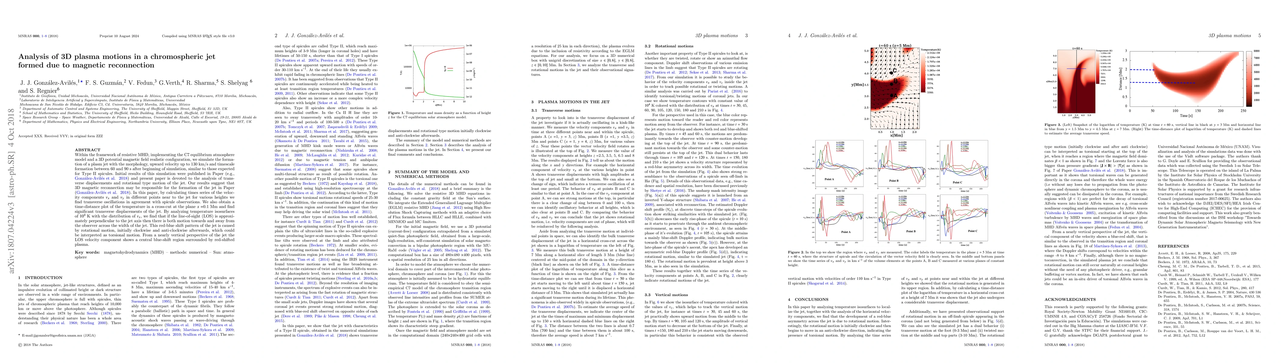 Within the framework of resistive MHD, implementing the C7 equilibrium atmosphere model and a 3D potential magnetic field realistic configuration, we simulate the formation of a plasm jet with the morphology, upward velocity up to 130 km/s and timescale formation between 60 and 90 s after beginning of simulation, similar to those expected for Type II spicules. Initial results of this simulation were published in Paper (e.g., Gonz\'alez-Avil\'es et al. 2018) and present paper is devoted to the analysis of transverse displacements and rotational type motion of the jet. Our results suggest that 3D magnetic reconnection may be responsible for the formation of the jet in Paper (Gonz\'alez-Avil\'es et al. 2018). In this paper, by calculating times series of the velocity components $v_x$ and $v_y$ in different points near to the jet for various heights we find transverse oscillations in agreement with spicule observations. We also obtain a time-distance plot of the temperature in a cross-cut at the plane $x=$0.1 Mm and find significant transverse displacements of the jet. By analyzing temperature isosurfaces of $10^{4}$ K with the distribution of $v_x$, we find that if the line-of-sight (LOS) is approximately perpendicular to the jet axis then there is both motion towards and away from the observer across the width of the jet. This red-blue shift pattern of the jet is caused by rotational motion, initially clockwise and anti-clockwise afterwards, which could be interpreted as torsional motion. From a nearly vertical perspective of the jet the LOS velocity component shows a central blue-shift region surrounded by red-shifted plasma.