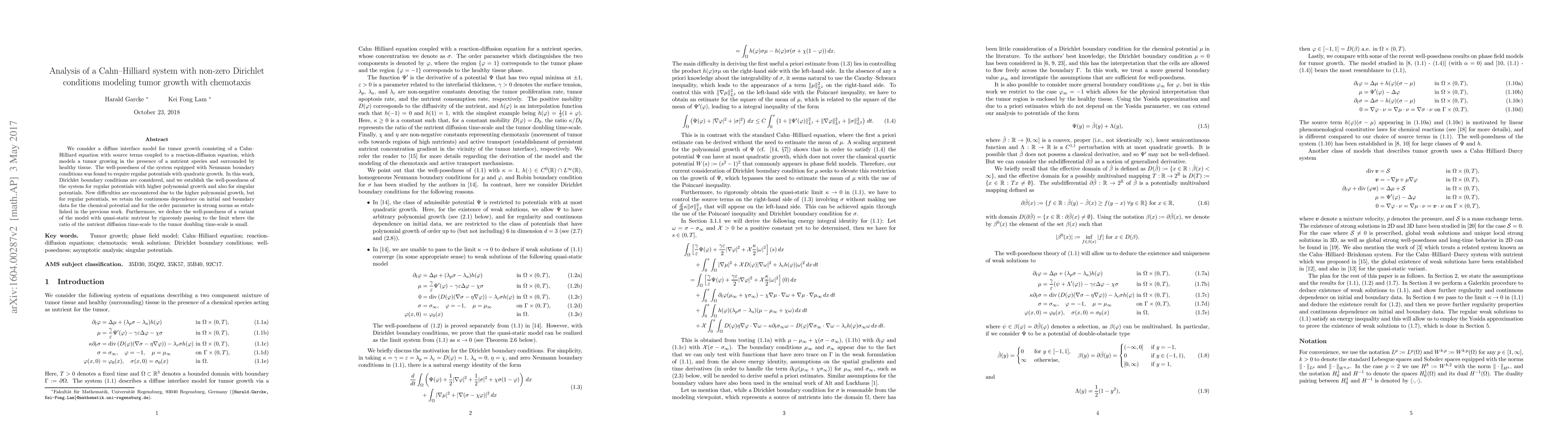 We consider a diffuse interface model for tumor growth consisting of a Cahn--Hilliard equation with source terms coupled to a reaction-diffusion equation, which models a tumor growing in the presence of a nutrient species and surrounded by healthy tissue. The well-posedness of the system equipped with Neumann boundary conditions was found to require regular potentials with quadratic growth. In this work, Dirichlet boundary conditions are considered, and we establish the well-posedness of the system for regular potentials with higher polynomial growth and also for singular potentials. New difficulties are encountered due to the higher polynomial growth, but for regular potentials, we retain the continuous dependence on initial and boundary data for the chemical potential and for the order parameter in strong norms as established in the previous work. Furthermore, we deduce the well-posedness of a variant of the model with quasi-static nutrient by rigorously passing to the limit where the ratio of the nutrient diffusion time-scale to the tumor doubling time-scale is small.