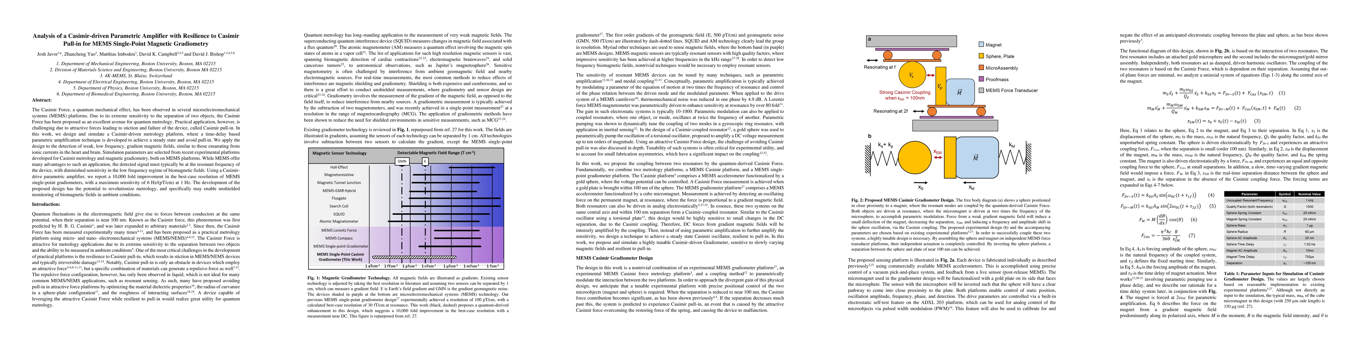 This paper presents a novel Casimir-driven parametric amplifier designed to mitigate the pull-in effect in MEMS devices, enhancing their sensitivity for low-frequency magnetic field detection. The proposed design achieves a 10,000-fold improvement in resolution for single-point gradiometers, enabling the detection of biomagnetic fields in ambient conditions.