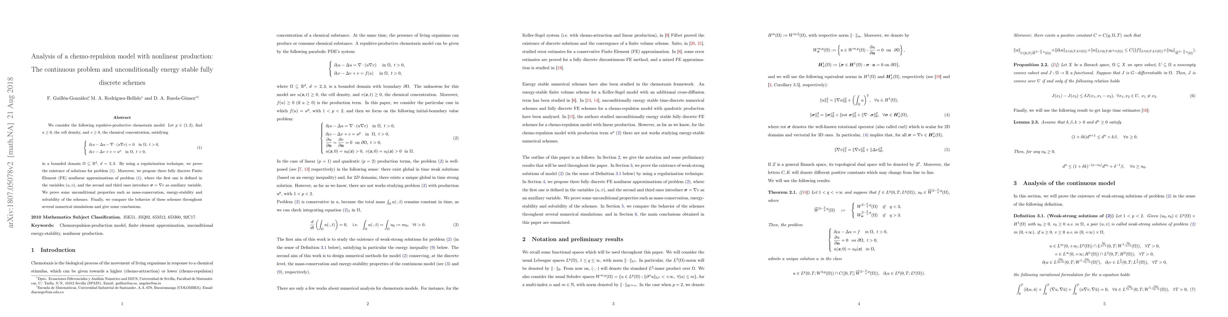 We consider the following repulsive-productive chemotaxis model: Let $p\in (1,2)$, find $u \geq 0$, the cell density, and $v \geq 0$, the chemical concentration, satisfying \begin{equation}\label{C5:Am} \left\{ \begin{array} [c]{lll} \partial_t u - \Delta u - \nabla\cdot (u\nabla v)=0 \ \ \mbox{in}\ \Omega,\ t>0,\\ \partial_t v - \Delta v + v = u^p \ \ \mbox{in}\ \Omega,\ t>0, \end{array} \right. \end{equation} in a bounded domain $\Omega\subseteq \mathbb{R}^d$, $d=2,3$. By using a regularization technique, we prove the existence of solutions of this problem. Moreover, we propose three fully discrete Finite Element (FE) nonlinear approximations, where the first one is defined in the variables $(u,v)$, and the second and third ones by introducing ${\boldsymbol\sigma}=\nabla v$ as an auxiliary variable. We prove some unconditional properties such as mass-conservation, energy-stability and solvability of the schemes. Finally, we compare the behavior of the schemes throughout several numerical simulations and give some conclusions.