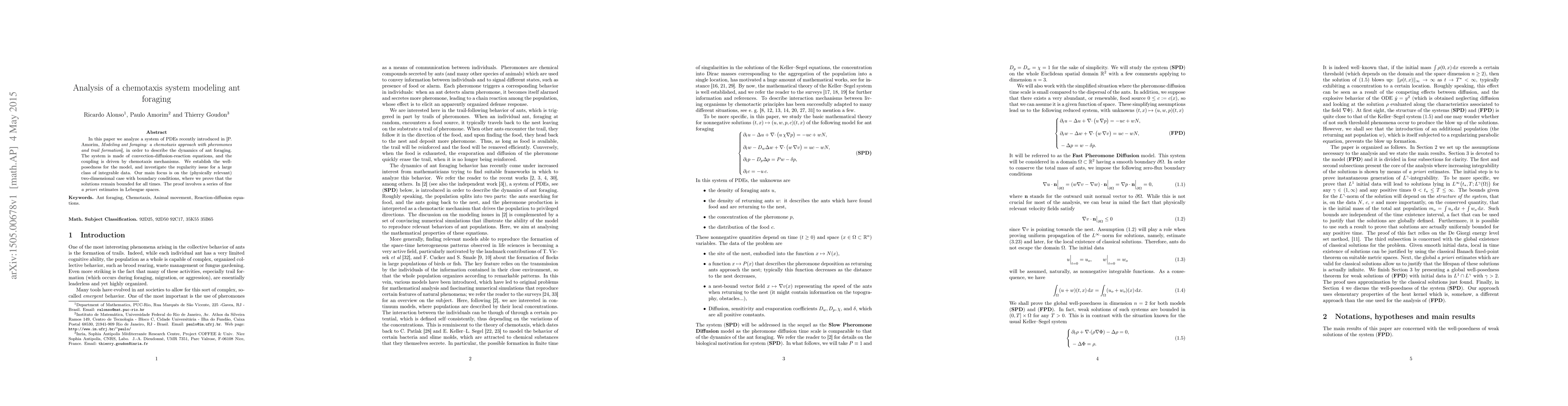 This paper analyzes a chemotaxis system of PDEs modeling ant foraging dynamics, focusing on the two-dimensional case with boundary conditions. The authors establish well-posedness and boundedness of solutions for a large class of integrable data, employing fine a priori estimates in Lebesgue spaces.