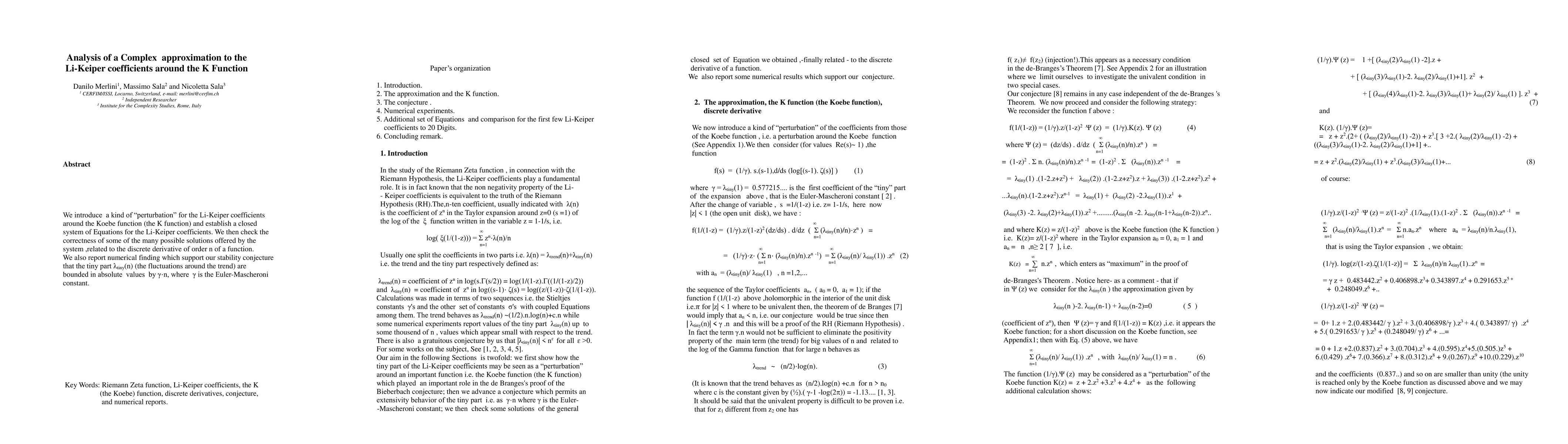 We introduce a kind of "perturbation" for the Li-Keiper coefficients around the Koebe function (the K function) and establish a closed system of Equations for the Li-Keiper coefficients. We then check the correctness of some of the many possible solutions offered by the system ,related to the discrete derivative of order n of a function. We also report numerical finding which support our stability conjecture that the tiny part lambda-tiny(n) (the fluctuations around the trend) are bounded in absolute values by gammaxn, where gamma is the Euler-Mascheroni constant.