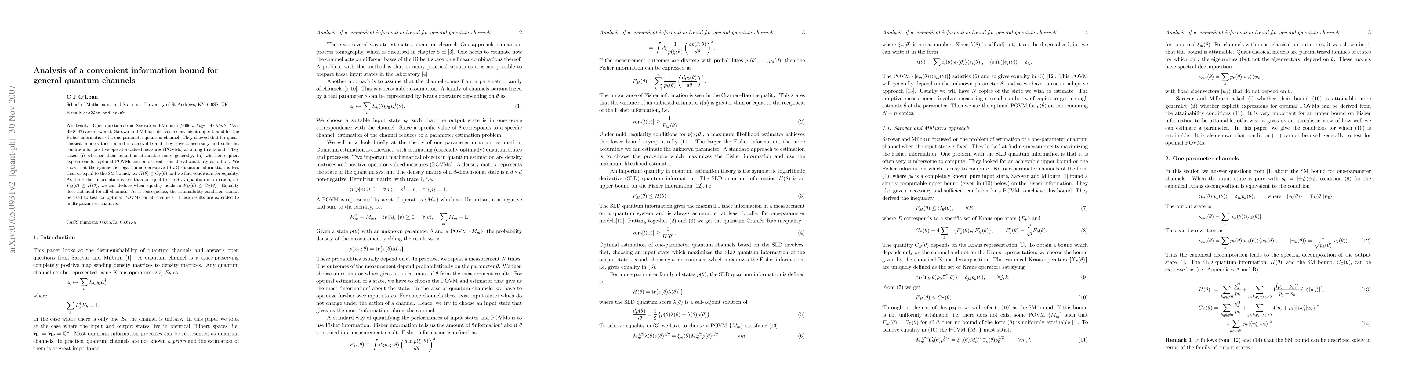 Open questions from Sarovar and Milburn (2006 J.Phys. A: Math. Gen. 39 8487) are answered. Sarovar and Milburn derived a convenient upper bound for the Fisher information of a one-parameter quantum channel. They showed that for quasi-classical models their bound is achievable and they gave a necessary and sufficient condition for positive operator-valued measures (POVMs) attaining this bound. They asked (i) whether their bound is attainable more generally, (ii) whether explicit expressions for optimal POVMs can be derived from the attainability condition. We show that the symmetric logarithmic derivative (SLD) quantum information is less than or equal to the SM bound, i.e.\ $H(\theta) \leq C_{\Upsilon}(\theta)$ and we find conditions for equality. As the Fisher information is less than or equal to the SLD quantum information, i.e. $F_M(\theta) \leq H(\theta)$, we can deduce when equality holds in $F_M(\theta) \leq C_{\Upsilon}(\theta)$. Equality does not hold for all channels. As a consequence, the attainability condition cannot be used to test for optimal POVMs for all channels. These results are extended to multi-parameter channels.