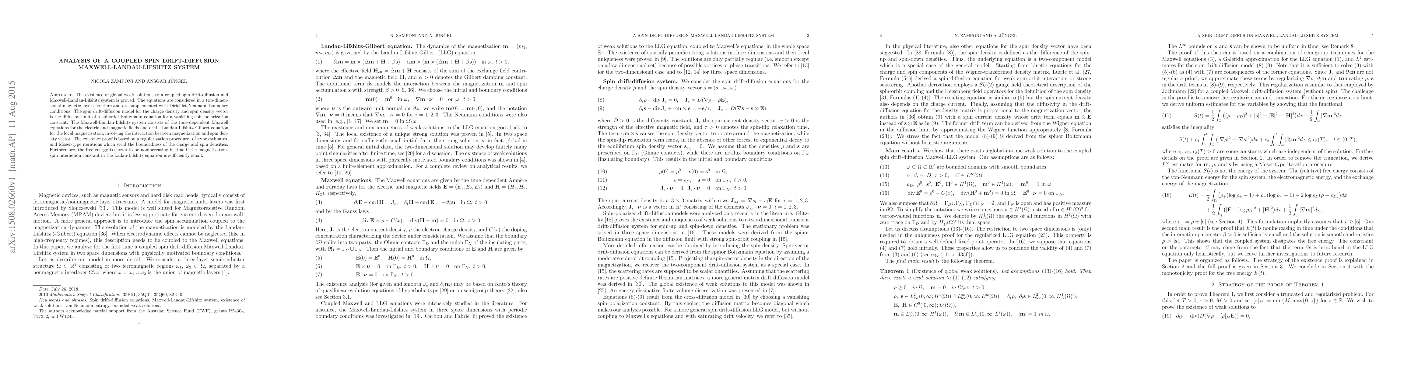 This paper proves the existence of global weak solutions for a coupled spin drift-diffusion and Maxwell-Landau-Lifshitz system in a two-dimensional magnetic layer, using regularization, $L^2$-type estimates, and Moser-type iterations, while demonstrating nonincreasing free energy under certain conditions.