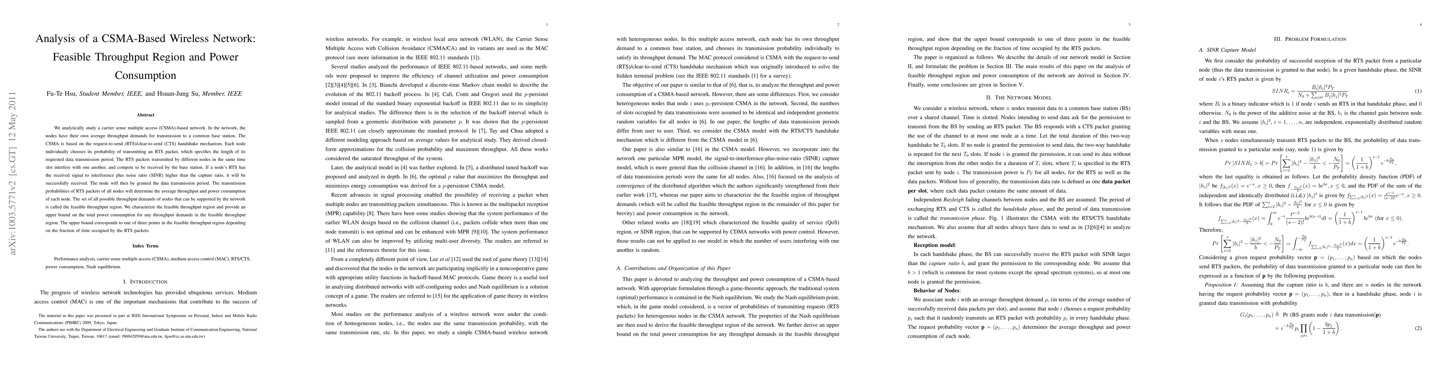 We analytically study a carrier sense multiple access (CSMA)-based network. In the network, the nodes have their own average throughput demands for transmission to a common base station. The CSMA is based on the request-to-send (RTS)/clear-to-send (CTS) handshake mechanism. Each node individually chooses its probability of transmitting an RTS packet, which specifies the length of its requested data transmission period. The RTS packets transmitted by different nodes in the same time slot interfere with one another, and compete to be received by the base station. If a node's RTS has the received signal to interference plus noise ratio (SINR) higher than the capture ratio, it will be successfully received. The node will then be granted the data transmission period. The transmission probabilities of RTS packets of all nodes will determine the average throughput and power consumption of each node. The set of all possible throughput demands of nodes that can be supported by the network is called the feasible throughput region. We characterize the feasible throughput region and provide an upper bound on the total power consumption for any throughput demands in the feasible throughput region. The upper bound corresponds to one of three points in the feasible throughput region depending on the fraction of time occupied by the RTS packets.