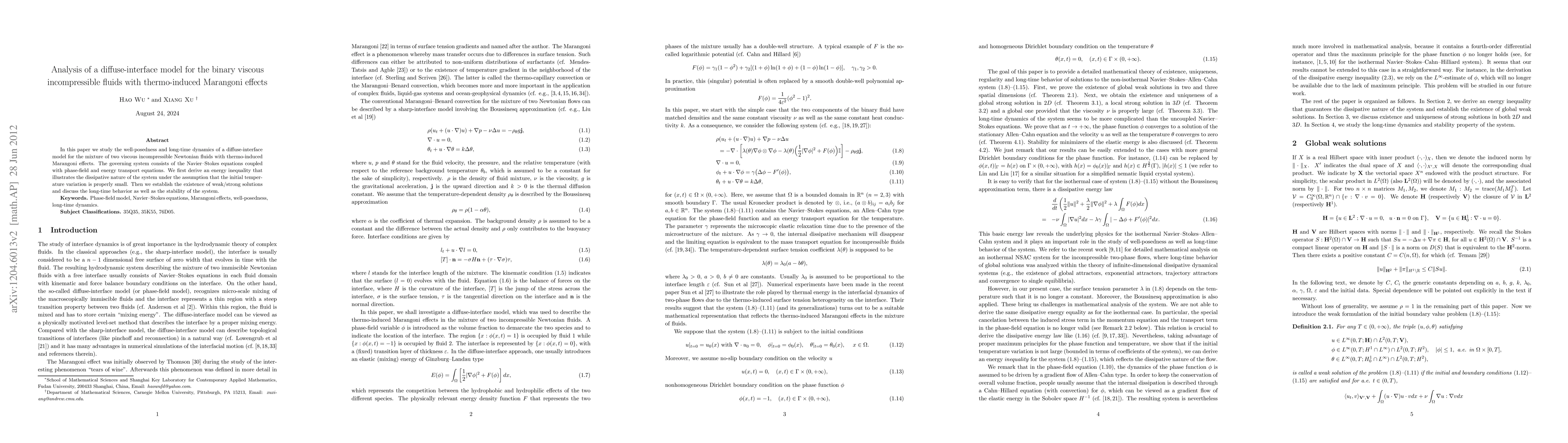 This paper investigates the well-posedness and dynamics of a diffuse-interface model for binary viscous incompressible fluids with thermo-induced Marangoni effects, deriving an energy inequality to demonstrate the system's dissipative nature and establishing the existence of weak/strong solutions via the energy method.