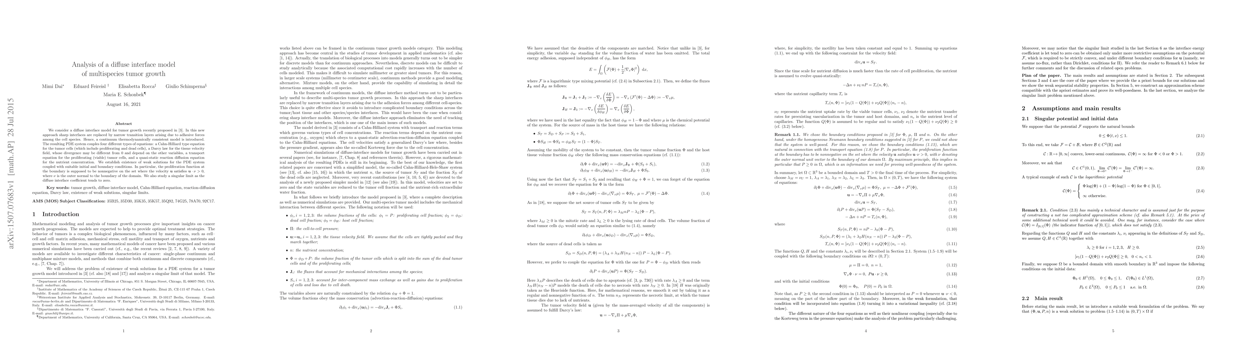 This paper analyzes a diffuse interface model for multispecies tumor growth, replacing sharp interfaces with transition layers due to cell adhesive forces. The model includes a Cahn-Hilliard equation, Darcy law, transport equation, and reaction diffusion equation for nutrient concentration, establishing existence of weak solutions and examining the singular limit as the diffuse interface coefficient approaches zero.