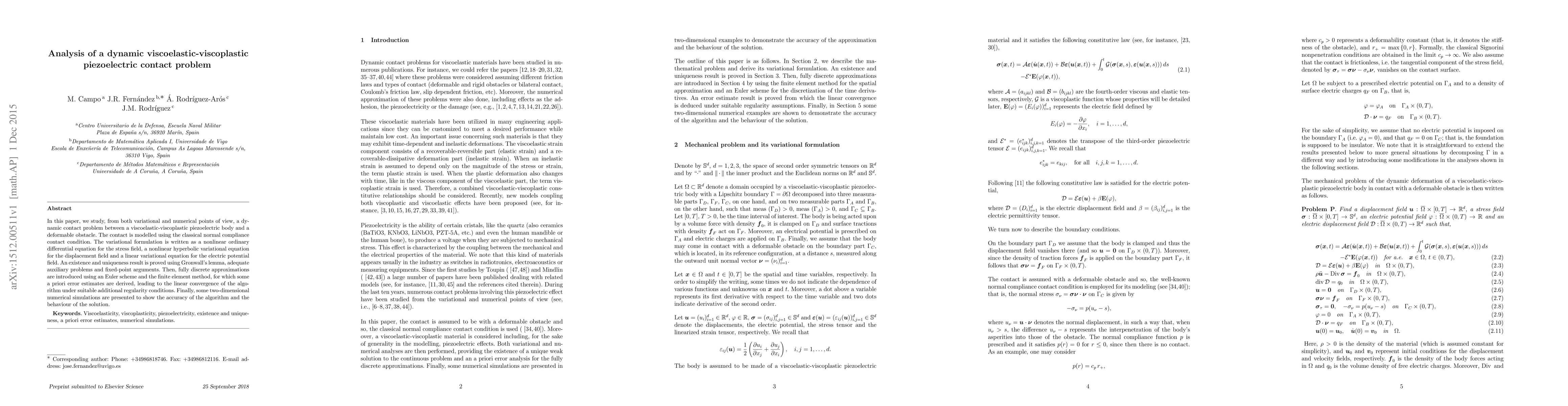 In this paper, we study, from both variational and numerical points of view, a dynamic contact problem between a viscoelastic-viscoplastic piezoelectric body and a deformable obstacle. The contact is modelled using the classical normal compliance contact condition. The variational formulation is written as a nonlinear ordinary differential equation for the stress field, a nonlinear hyperbolic variational equation for the displacement field and a linear variational equation for the electric potential field. An existence and uniqueness result is proved using Gronwall's lemma, adequate auxiliary problems and fixed-point arguments. Then, fully discrete approximations are introduced using an Euler scheme and the finite element method, for which some a priori error estimates are derived, leading to the linear convergence of the algorithm under suitable additional regularity conditions. Finally, some two-dimensional numerical simulations are presented to show the accuracy of the algorithm and the behaviour of the solution.
