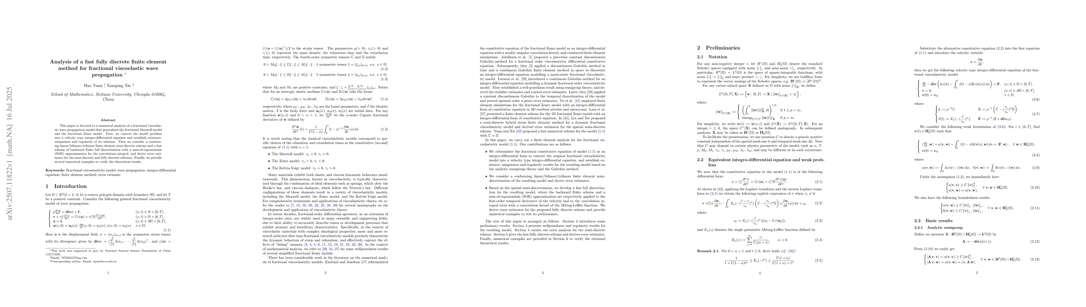 This paper is devoted to a numerical analysis of a fractional viscoelastic wave propagation model that generalizes the fractional Maxwell model and the fractional Zener model. First, we convert the model problem into a velocity type integro-differential equation and establish existence, uniqueness and regularity of its solution. Then we consider a conforming linear/bilinear/trilinear finite element semi-discrete scheme and a fast scheme of backward Euler full discretization with a sum-of-exponentials (SOE) approximation for the convolution integral, and derive error estimates for the semi-discrete and fully discrete schemes. Finally, we provide several numerical examples to verify the theoretical results.