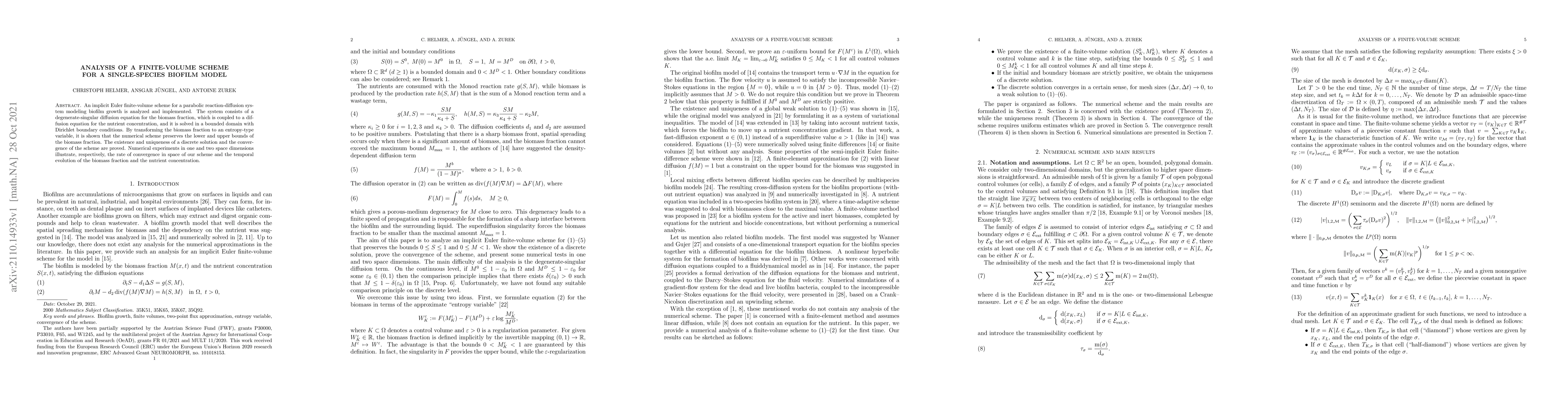 This paper analyzes and implements an implicit Euler finite-volume scheme for a reaction-diffusion model of biofilm growth, proving the existence, uniqueness, and convergence of the scheme. Numerical experiments demonstrate the scheme's spatial convergence and temporal dynamics of biomass and nutrient concentrations.