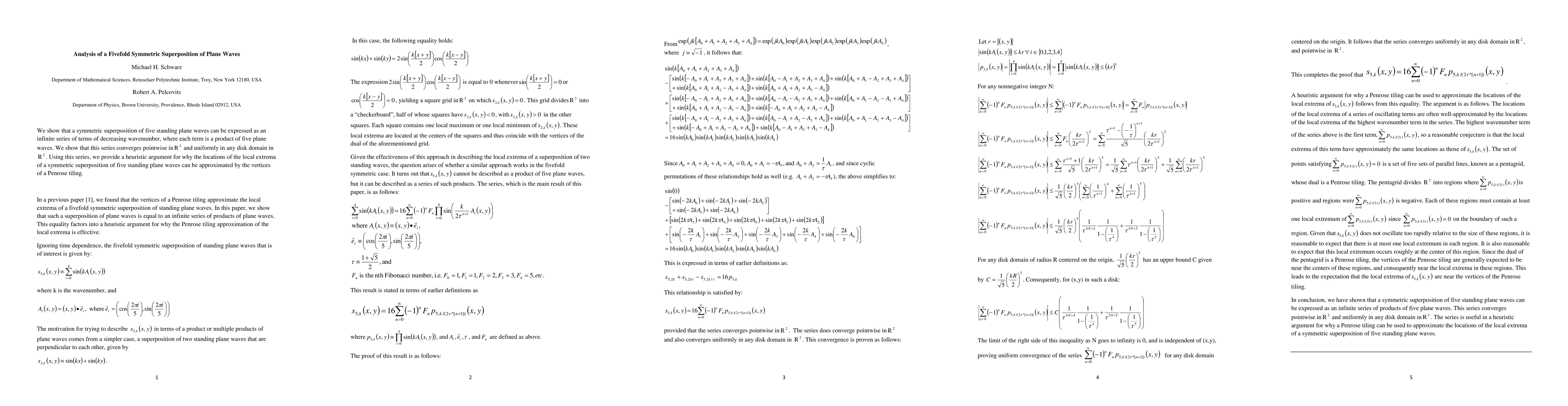 This paper demonstrates that a fivefold symmetric superposition of standing plane waves can be represented as an infinite series of decreasing wavenumber terms, converging pointwise in R^2 and uniformly within any disk. The study also provides a heuristic link between the local extrema of this superposition and the vertices of a Penrose tiling.