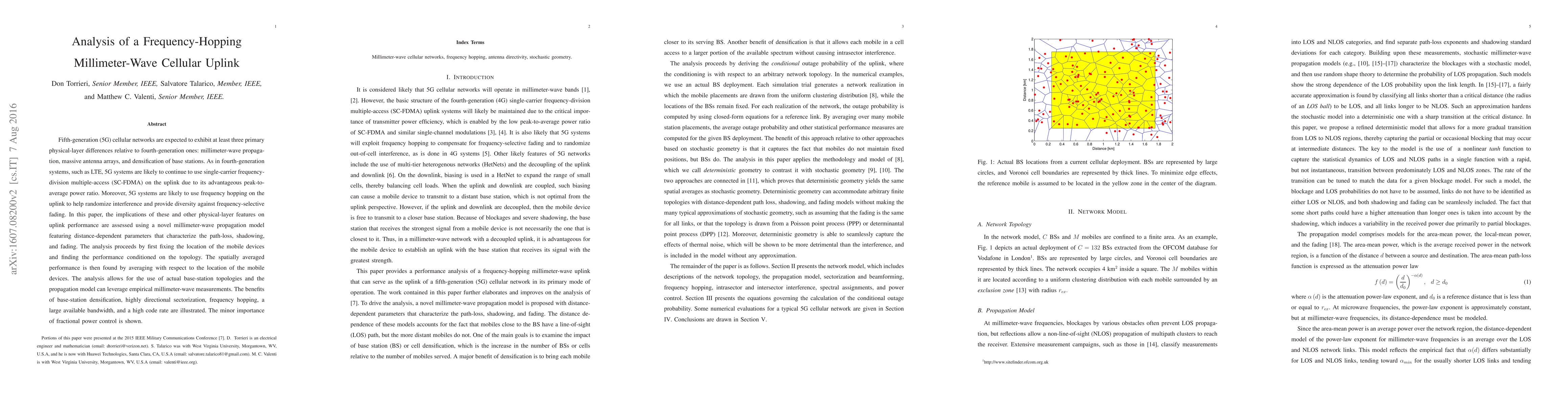 This paper analyzes the performance of a frequency-hopping millimeter-wave cellular uplink in 5G networks, assessing the impact of features like densification, massive antenna arrays, and frequency hopping. The study uses a novel propagation model and demonstrates the benefits of these features, while highlighting the minor role of fractional power control.