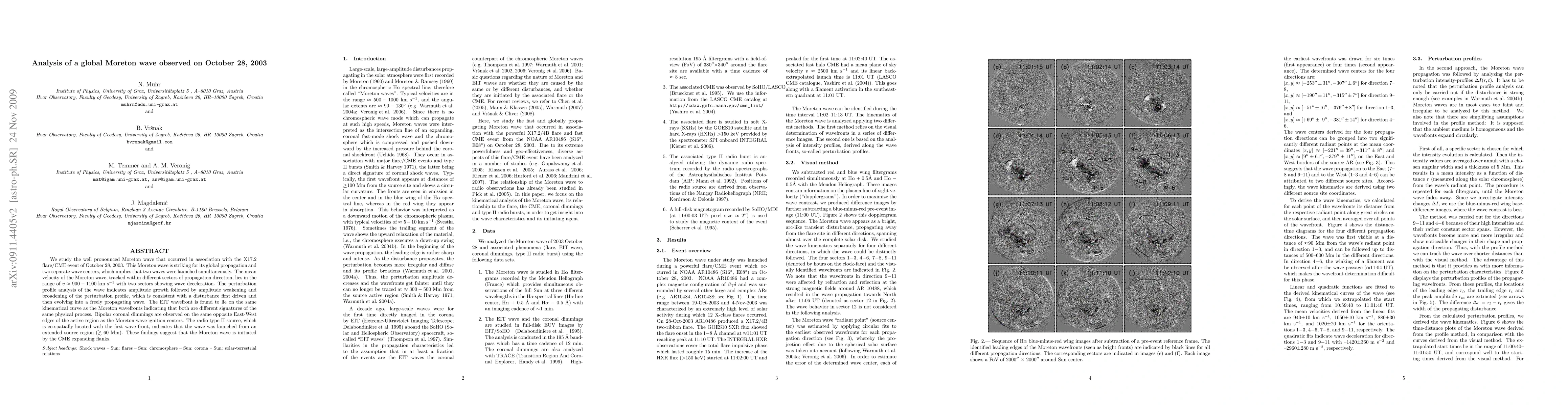 The research analyzes a globally propagating Moreton wave from the 2003 X17.2 flare, identifying two wave centers and suggesting simultaneous launches. It details velocity ranges, wave evolution, and correlation with EIT wavefronts and coronal dimmings. The study implies the wave originates from CME expanding flanks, supported by co-spatial radio type II source.