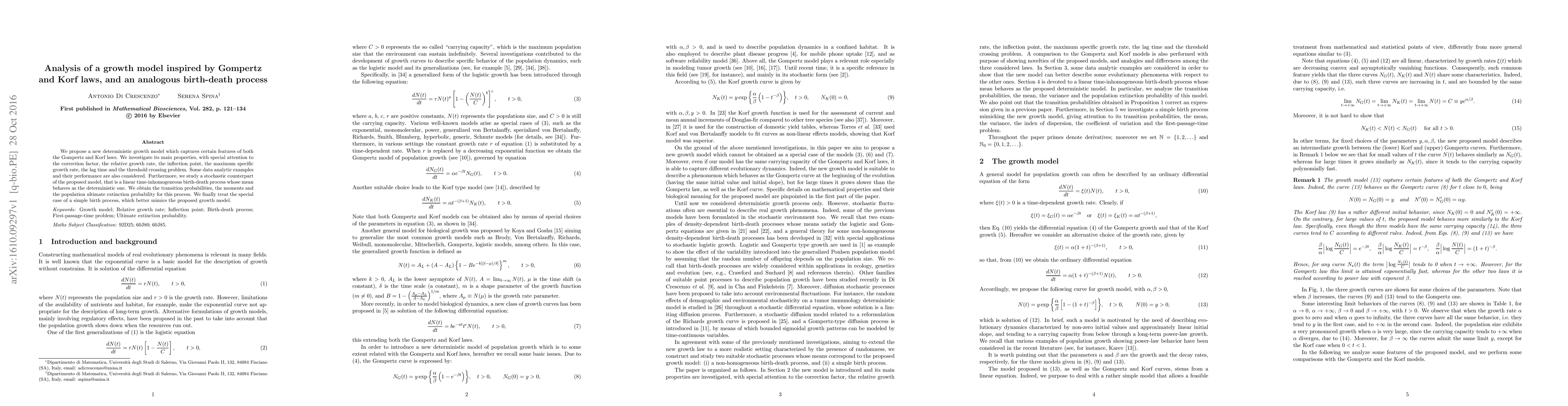 We propose a new deterministic growth model which captures certain features of both the Gompertz and Korf laws. We investigate its main properties, with special attention to the correction factor, the relative growth rate, the inflection point, the maximum specific growth rate, the lag time and the threshold crossing problem. Some data analytic examples and their performance are also considered. Furthermore, we study a stochastic counterpart of the proposed model, that is a linear time-inhomogeneous birth-death process whose mean behaves as the deterministic one. We obtain the transition probabilities, the moments and the population ultimate extinction probability for this process. We finally treat the special case of a simple birth process, which better mimics the proposed growth model.