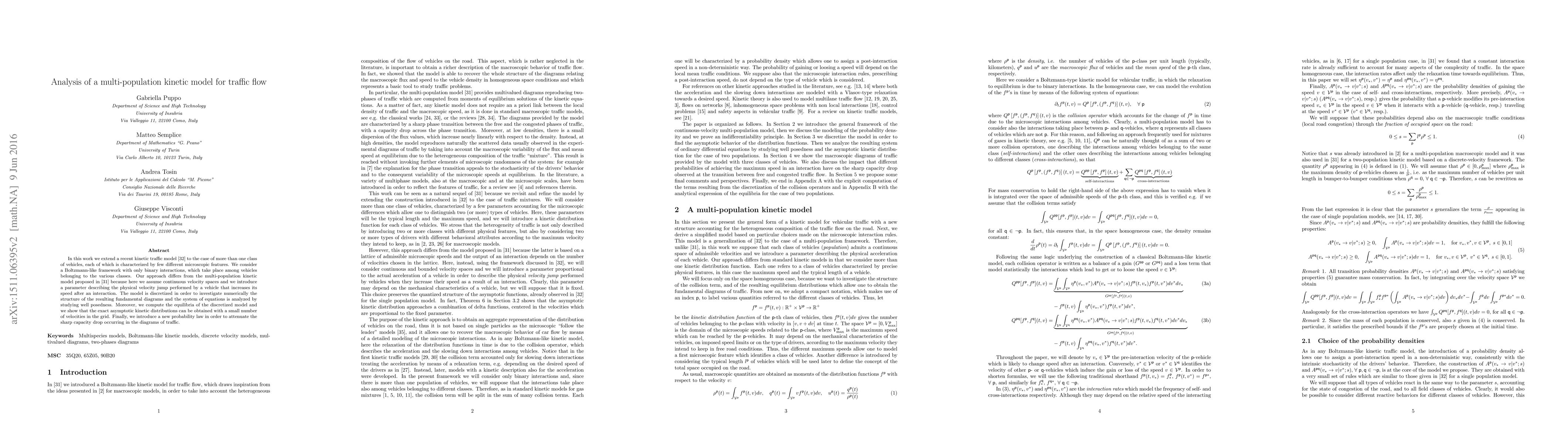 This paper extends a kinetic traffic model to include multiple vehicle classes, employing a Boltzmann-like framework with continuous velocity spaces and binary interactions. The model's equilibria and fundamental diagrams are numerically analyzed, revealing a new probability law to mitigate sharp capacity drops.