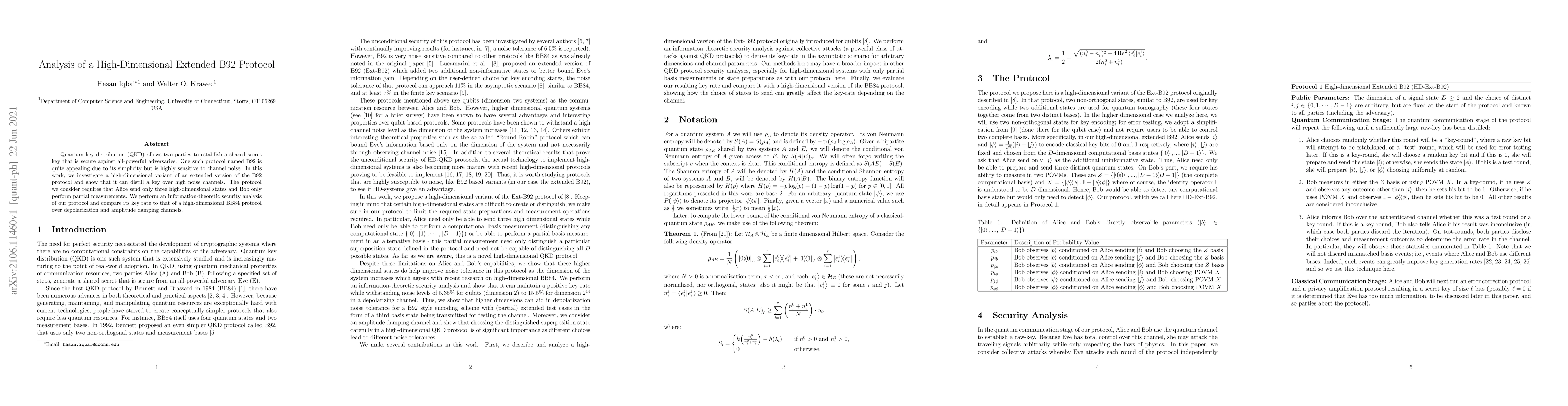 This paper analyzes a high-dimensional extended B92 protocol for quantum key distribution, demonstrating its ability to distill secure keys over noisy channels by using only three high-dimensional states and partial measurements. The study conducts an information-theoretic security analysis and compares its key rate to that of a high-dimensional BB84 protocol under various noise conditions.