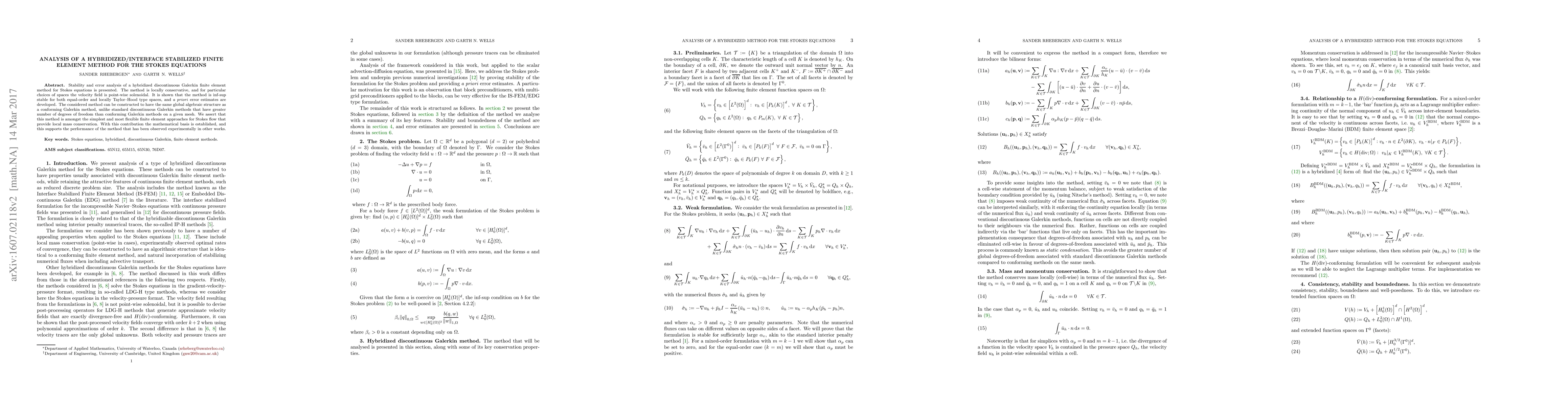 This paper presents a stability and error analysis of a hybridized finite element method for solving the Stokes equations, demonstrating its inf-sup stability and local conservation properties. The method is shown to be as efficient as conforming Galerkin methods while providing flexibility and local mass conservation.