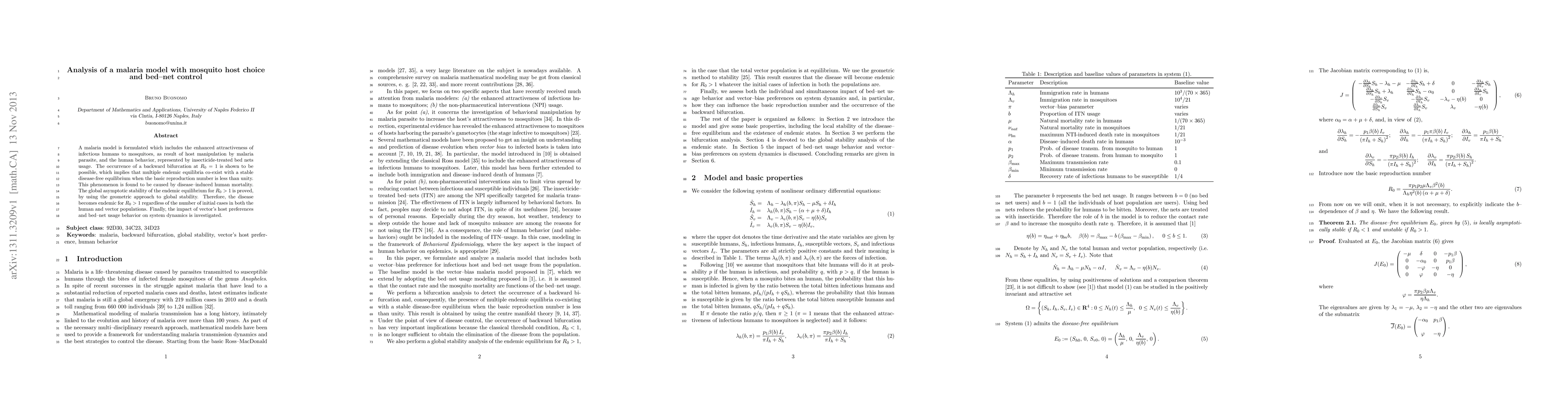 This paper formulates a malaria model incorporating mosquito host choice and bed-net usage, revealing a backward bifurcation at R_0=1 due to disease-induced human mortality. It proves the global stability of endemic equilibria for R_0>1, highlighting the impact of vector host preferences and bed-net usage on malaria dynamics.