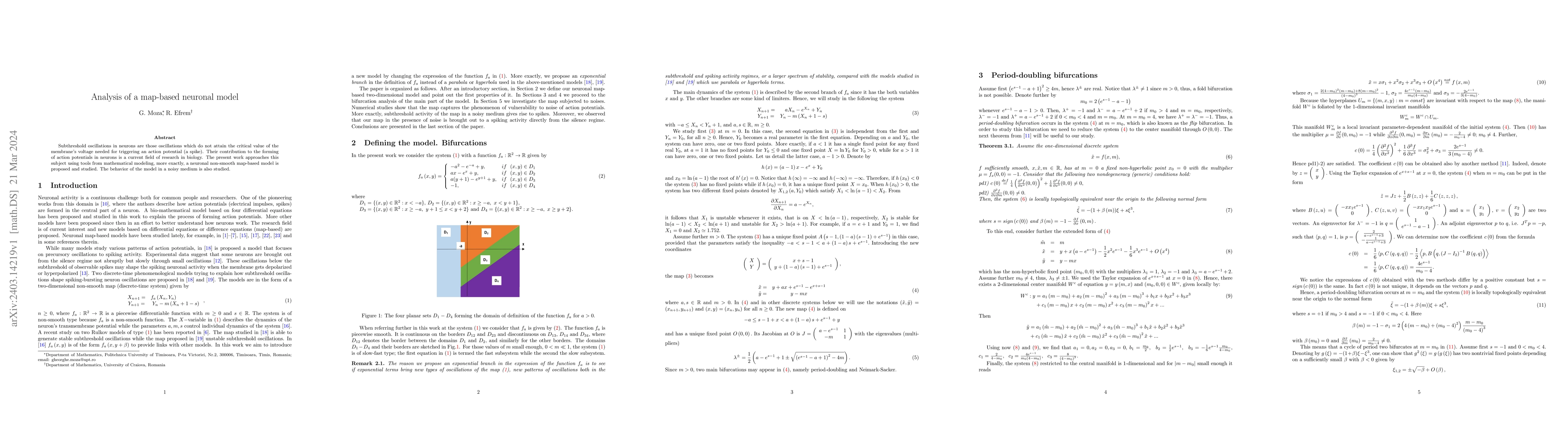Subthreshold oscillations in neurons are those oscillations which do not attain the critical value of the membrane's voltage needed for triggering an action potential (a spike). Their contribution to the forming of action potentials in neurons is a current field of research in biology. The present work approaches this subject using tools from mathematical modeling, more exactly, a neuronal non-smooth map-based model is proposed and studied. The behavior of the model in a noisy medium is also studied.