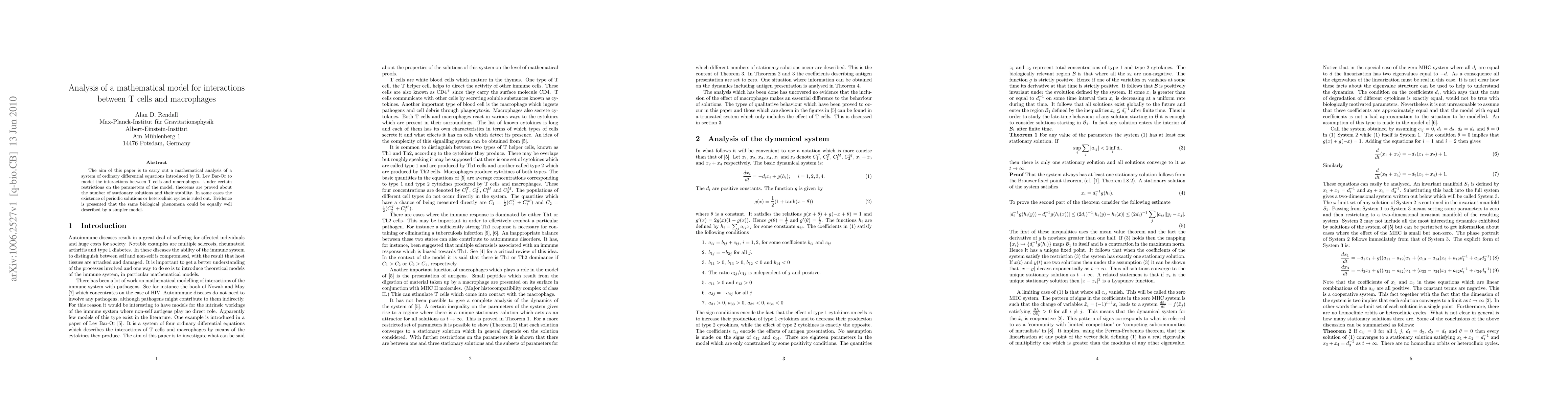 The aim of this paper is to carry out a mathematical analysis of a system of ordinary differential equations introduced by R. Lev Bar-Or to model the interactions between T cells and macrophages. Under certain restrictions on the parameters of the model, theorems are proved about the number of stationary solutions and their stability. In some cases the existence of periodic solutions or heteroclinic cycles is ruled out. Evidence is presented that the same biological phenomena could be equally well described by a simpler model.