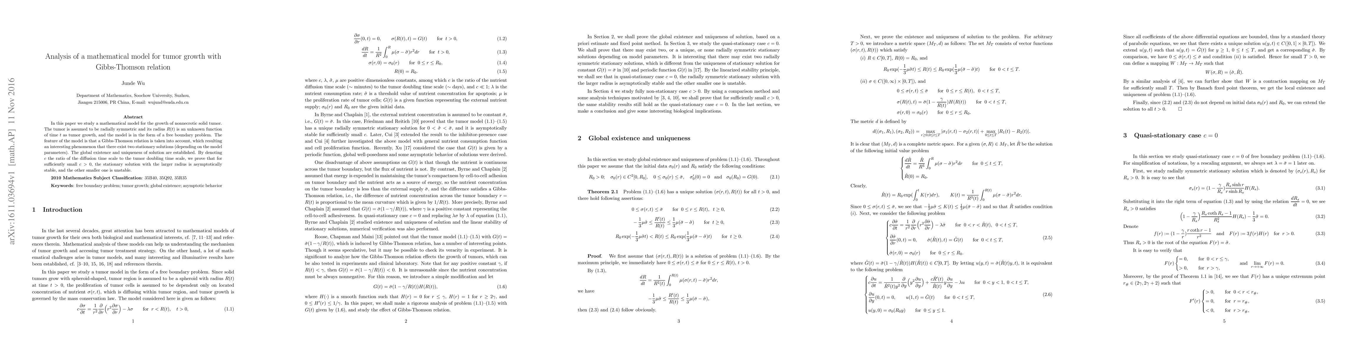 This paper analyzes a mathematical model for radially symmetric tumor growth incorporating a Gibbs-Thomson relation, revealing two stationary solutions. It establishes global existence and uniqueness, proving the larger radius solution is asymptotically stable for small diffusion-to-doubling time scale ratios.