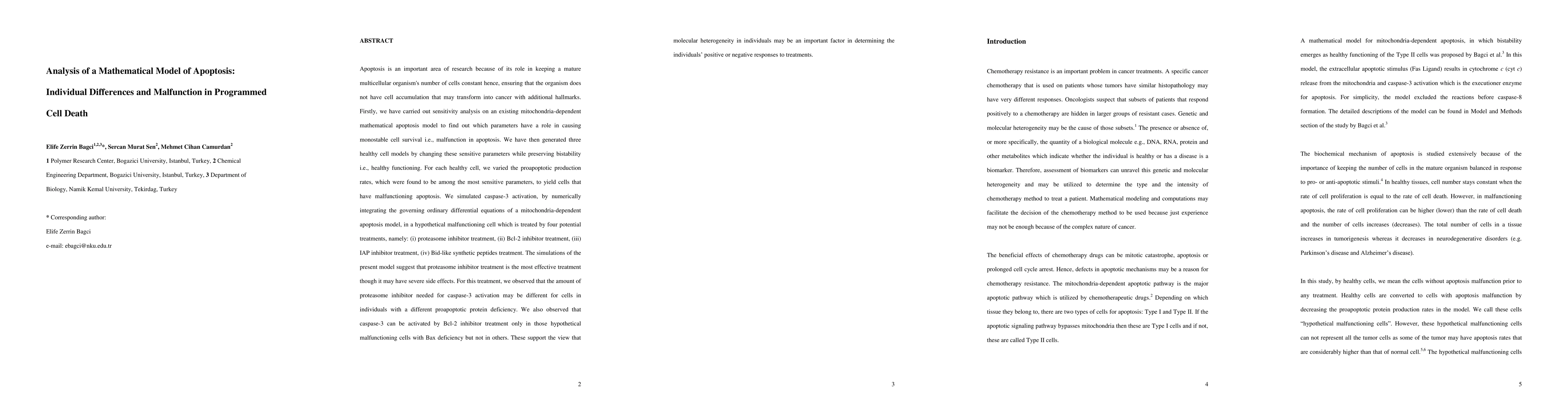 Apoptosis is an important area of research because of its role in keeping a mature multicellular organism's number of cells constant hence, ensuring that the organism does not have cell accumulation that may transform into cancer with additional hallmarks. Firstly, we have carried out sensitivity analysis on an existing mitochondria-dependent mathematical apoptosis model to find out which parameters have a role in causing monostable cell survival i.e., malfunction in apoptosis. We have then generated three healthy cell models by changing these sensitive parameters while preserving bistability i.e., healthy functioning. For each healthy cell, we varied the proapoptotic production rates, which were found to be among the most sensitive parameters, to yield cells that have malfunctioning apoptosis. We simulated caspase-3 activation, by numerically integrating the governing ordinary differential equations of a mitochondria-dependent apoptosis model, in a hypothetical malfunctioning cell which is treated by four potential treatments, namely: (i) proteasome inhibitor treatment, (ii) Bcl-2 inhibitor treatment, (iii) IAP inhibitor treatment, (iv) Bid-like synthetic peptides treatment. The simulations of the present model suggest that proteasome inhibitor treatment is the most effective treatment though it may have severe side effects. For this treatment, we observed that the amount of proteasome inhibitor needed for caspase-3 activation may be different for cells in individuals with a different proapoptotic protein deficiency. We also observed that caspase-3 can be activated by Bcl-2 inhibitor treatment only in those hypothetical malfunctioning cells with Bax deficiency but not in others. These support the view that molecular heterogeneity in individuals may be an important factor in determining the individuals' positive or negative responses to treatments.