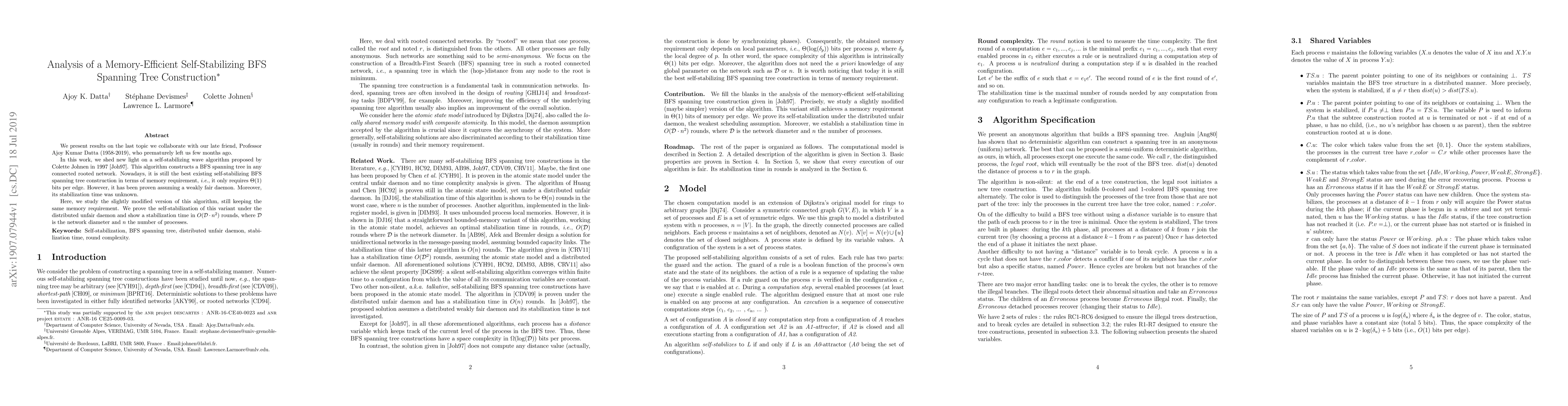 The paper presents a proof of self-stabilization and a stabilization time bound for a modified Johnen's BFS spanning tree algorithm under a distributed unfair daemon, preserving its memory efficiency.